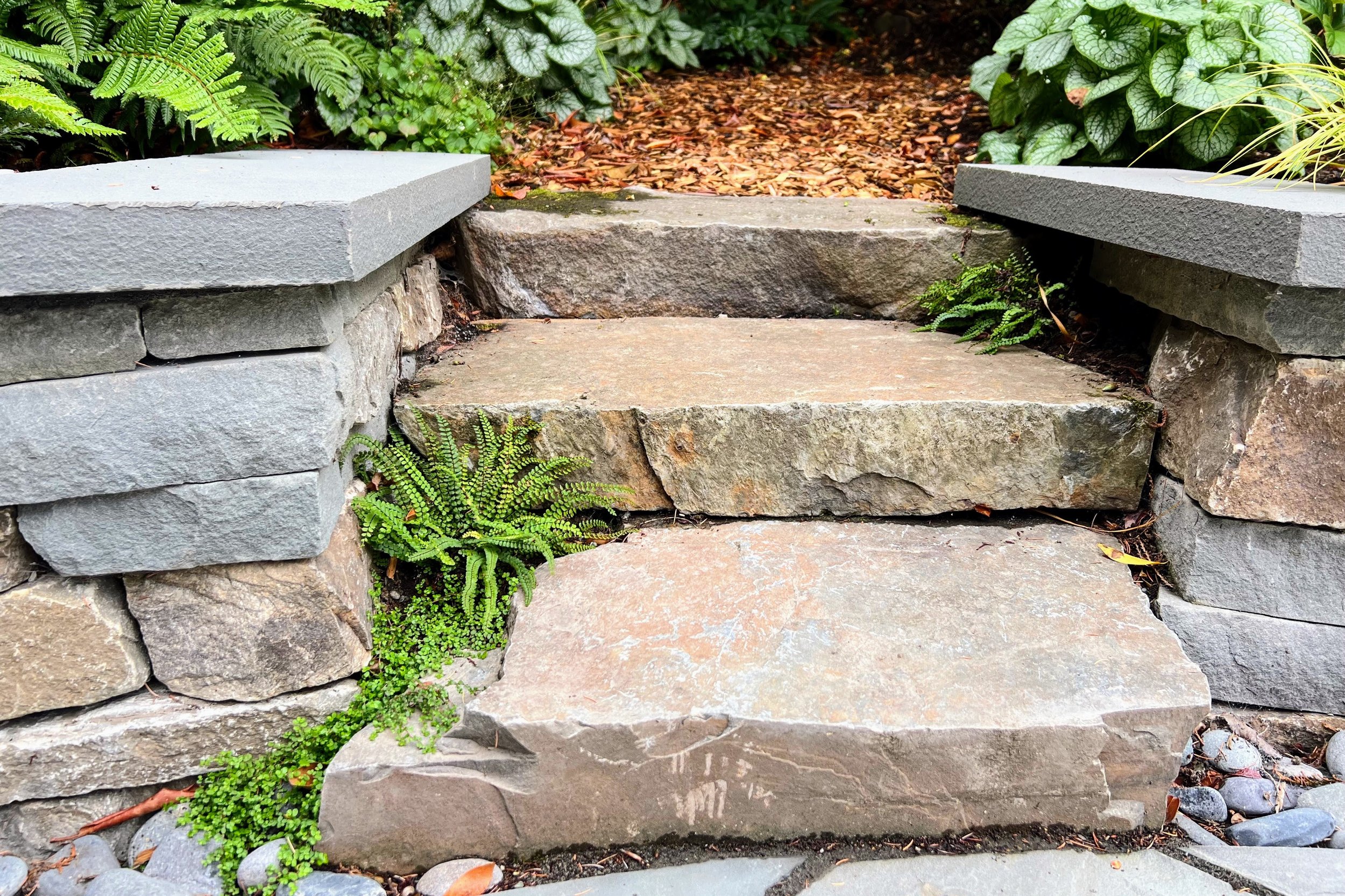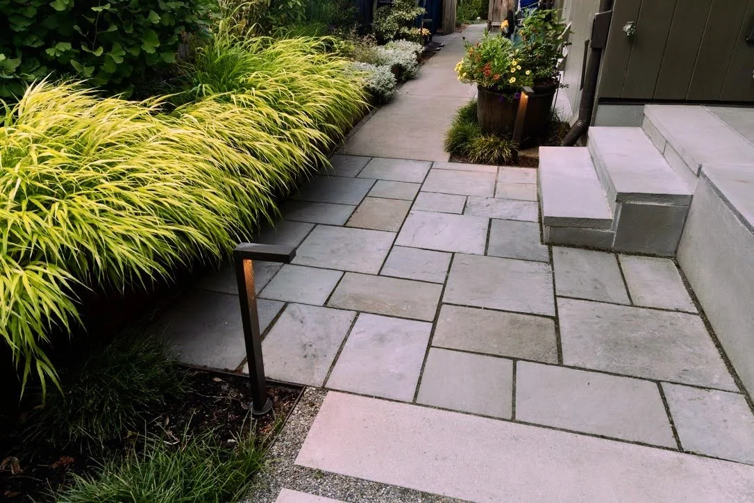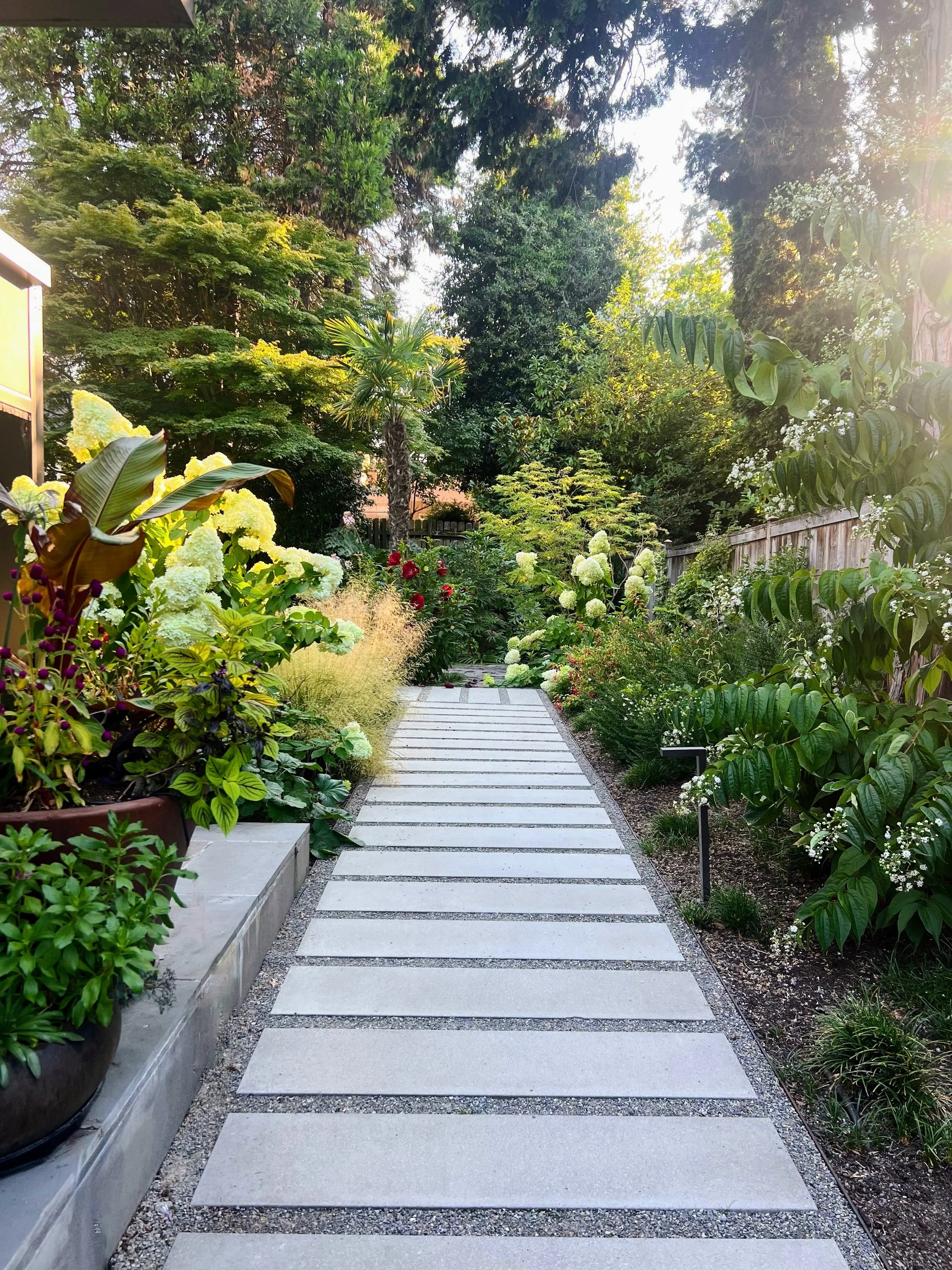 Create three pathways from the house patios to the lawn: a wide inground ‘boardwalk’, a wide stone path and a hidden children’s stone path.
