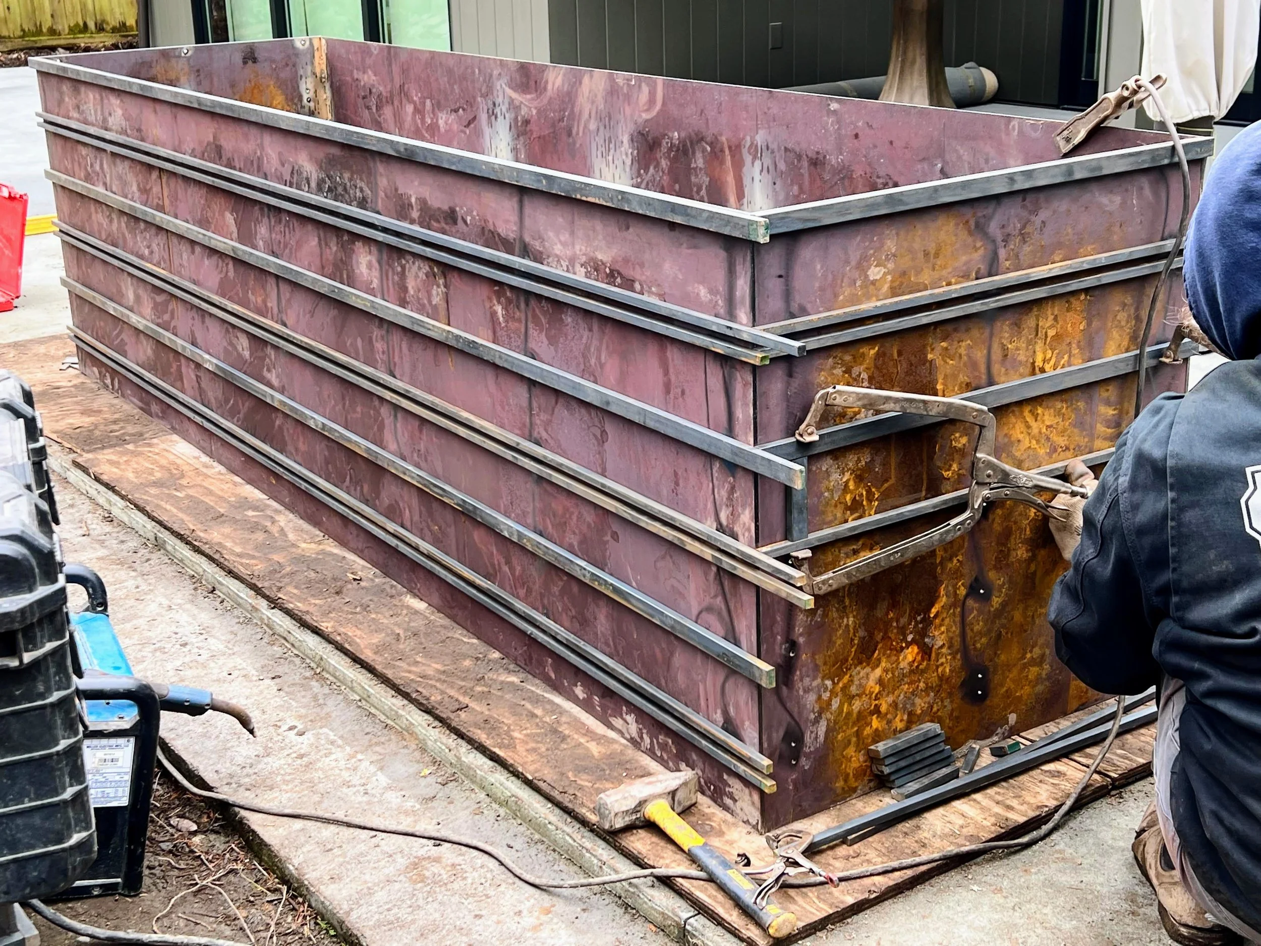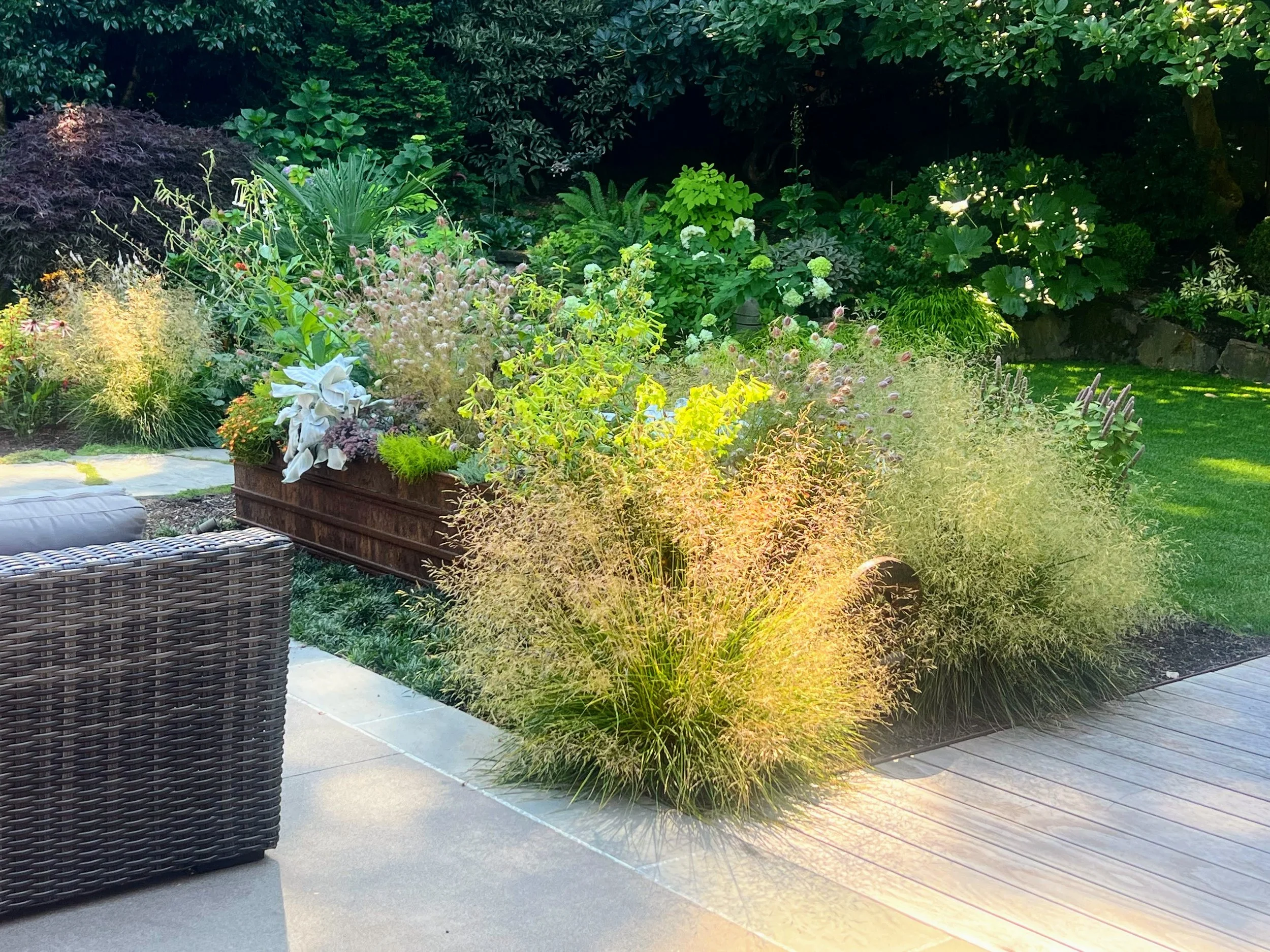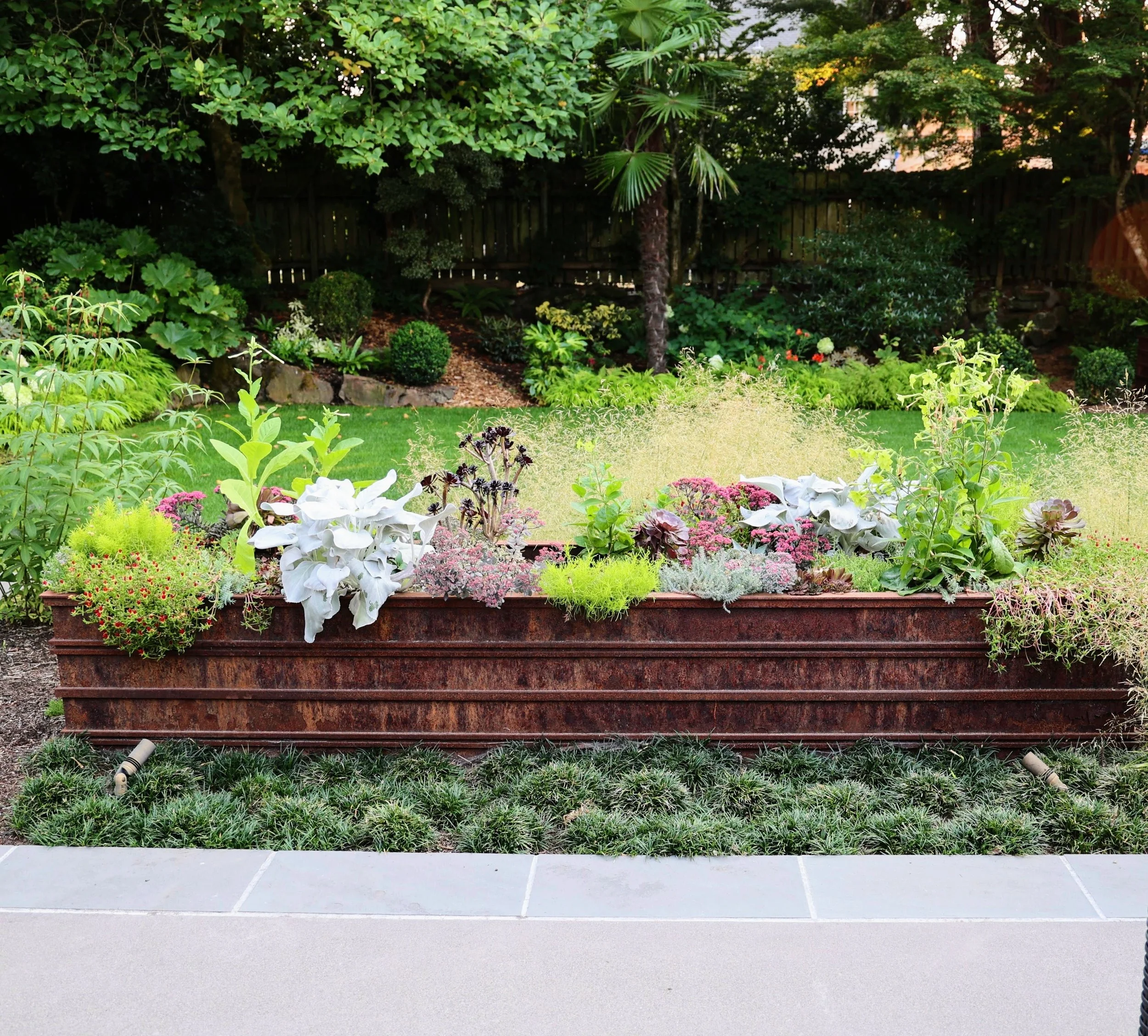 Create focal points for each patio, using large custom steel containers to bring the eye out into the garden and to act as ‘low walls’ , separating and defining areas.