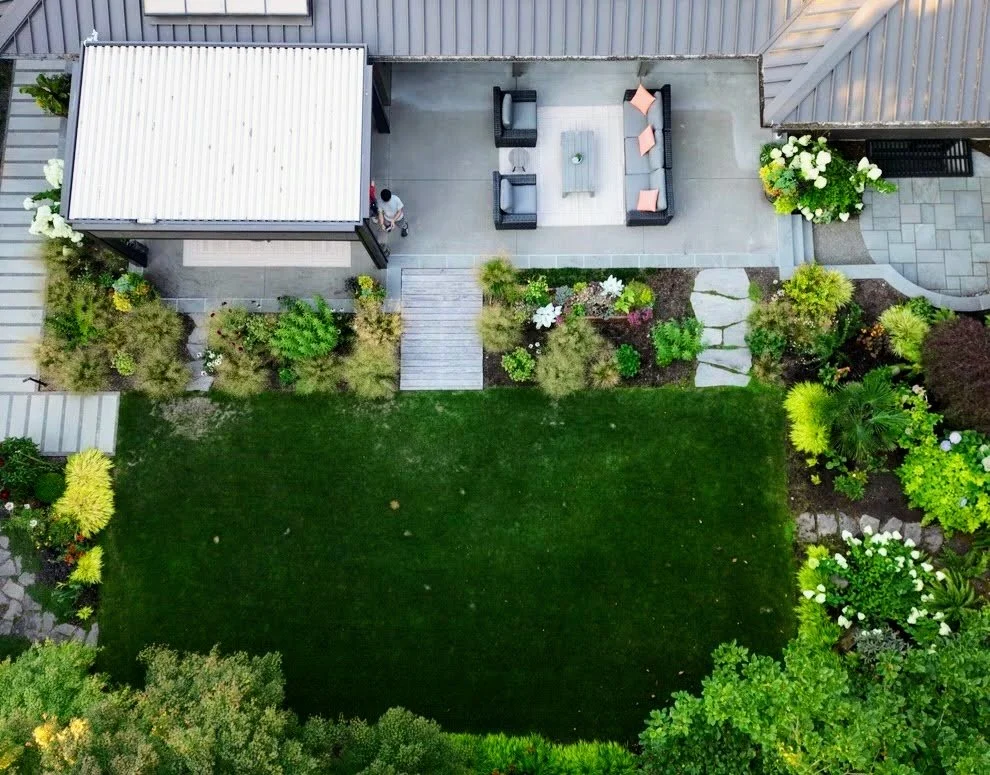 Use a meadow of ornamental grasses to separate the ‘ house patio rooms’ from the ‘lawn room’. This also creates an opportunity to teach kids about pollinators.