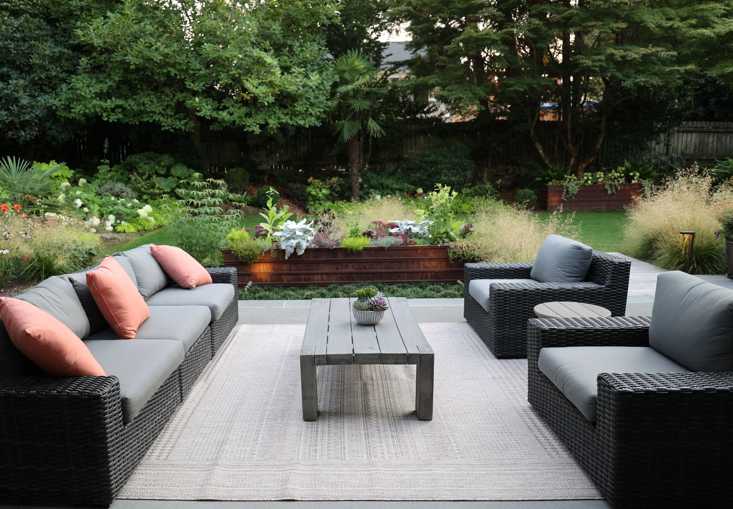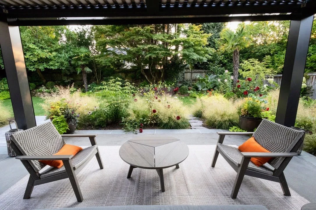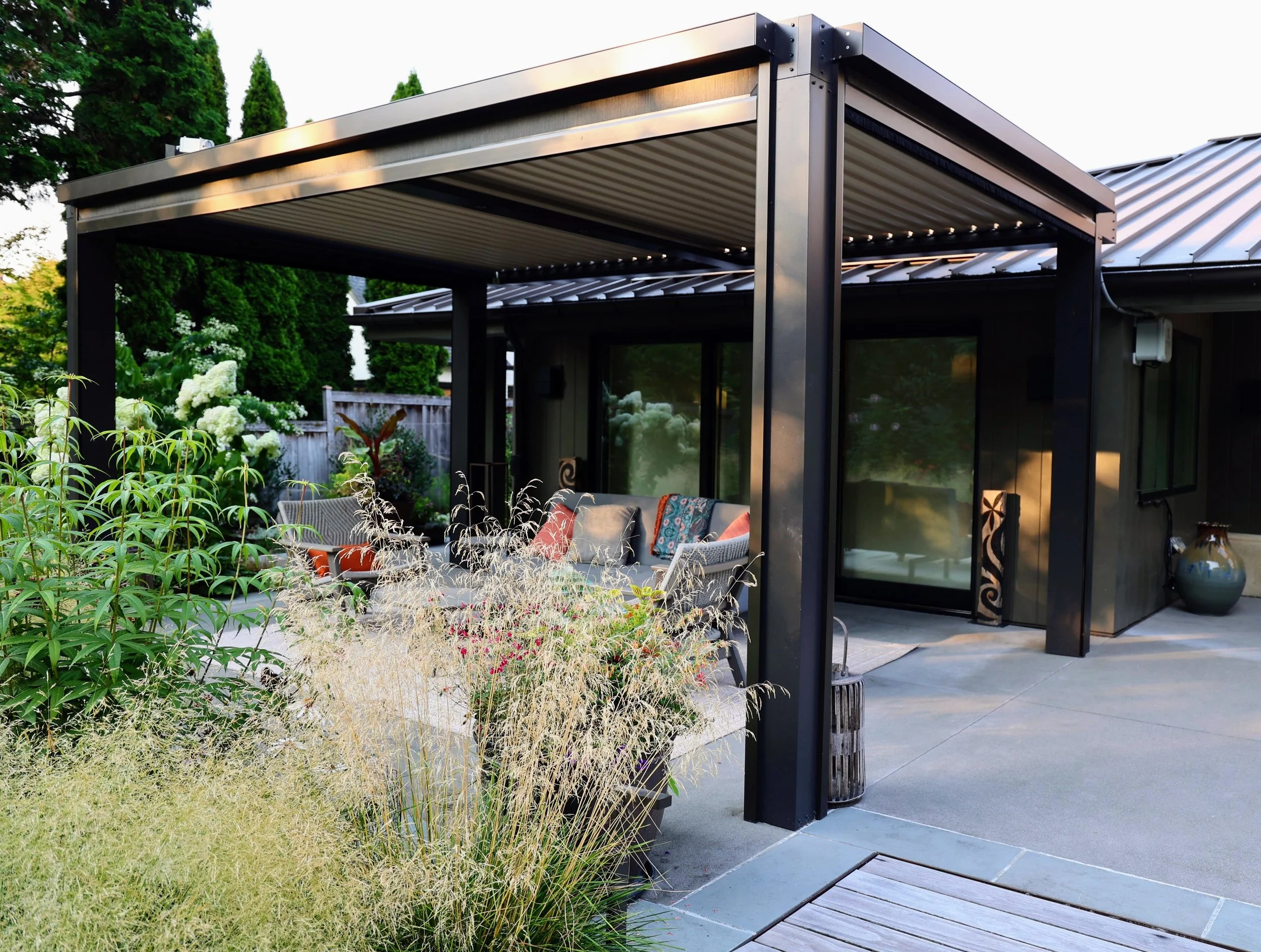Backyard: Designate two connected patio rooms adjoining the inside living areas to create seamless living spaces. Use a pergola with a louvered roof, lighting and shades to create an outdoor living room for all seasons on one side.