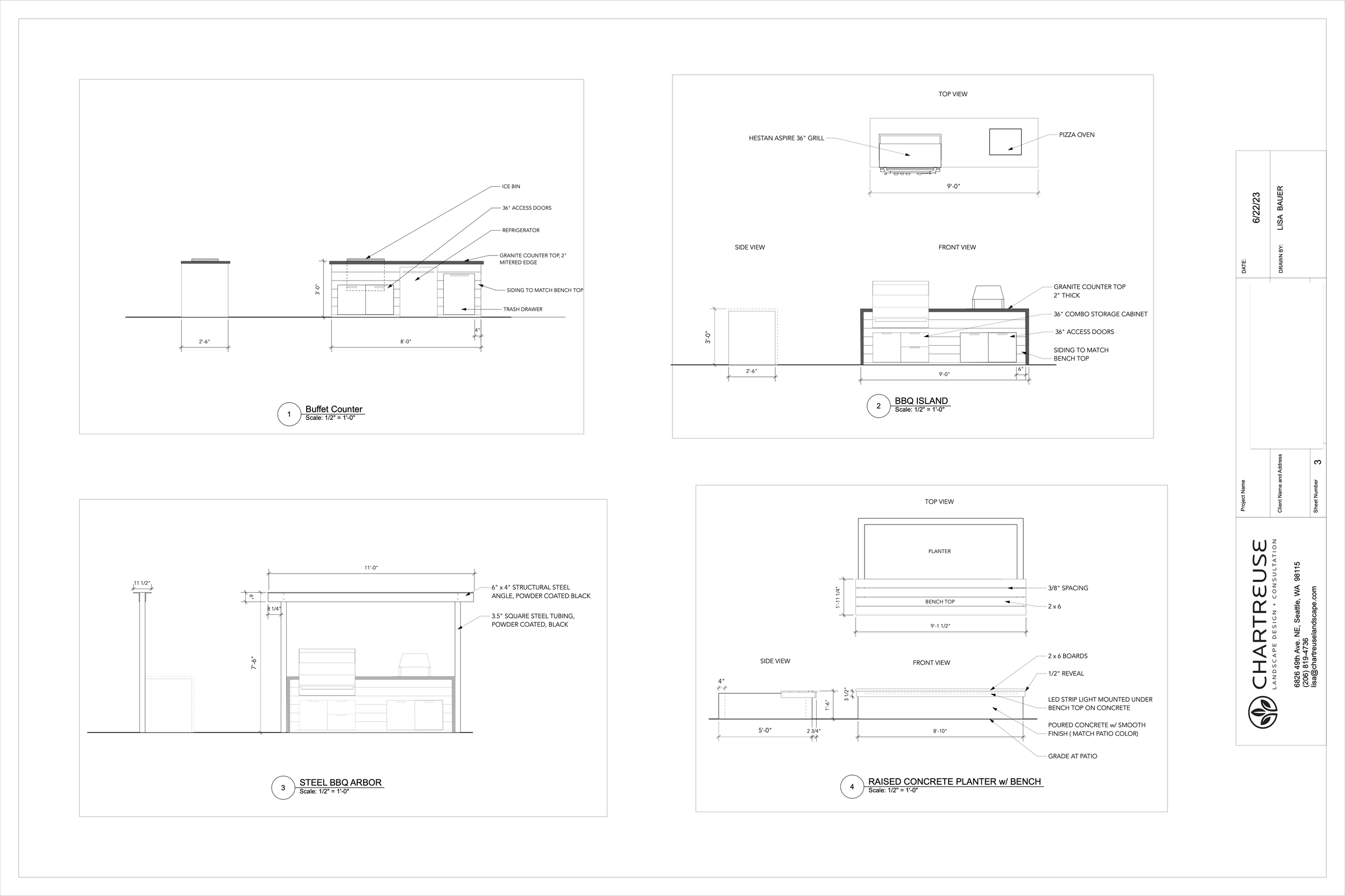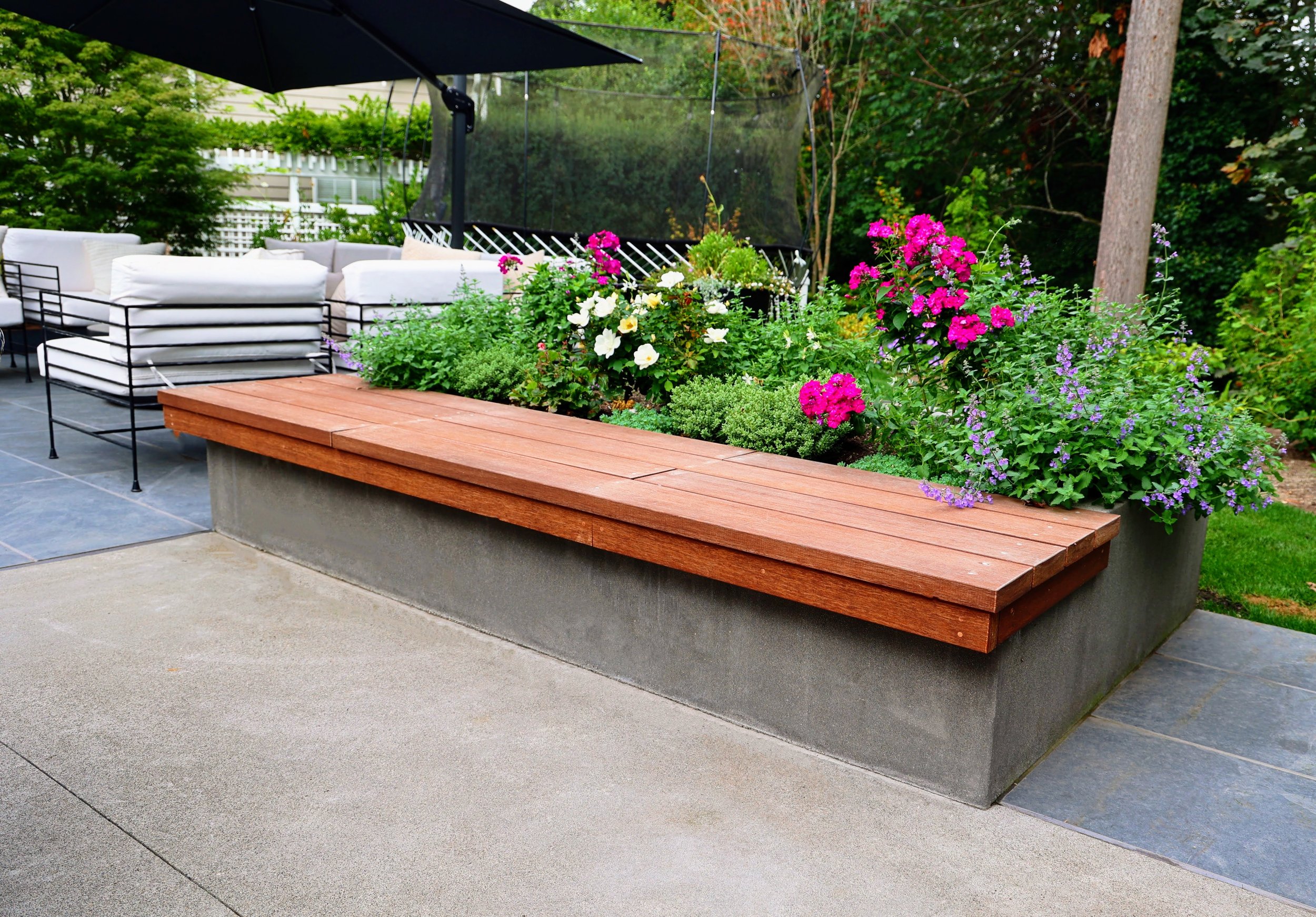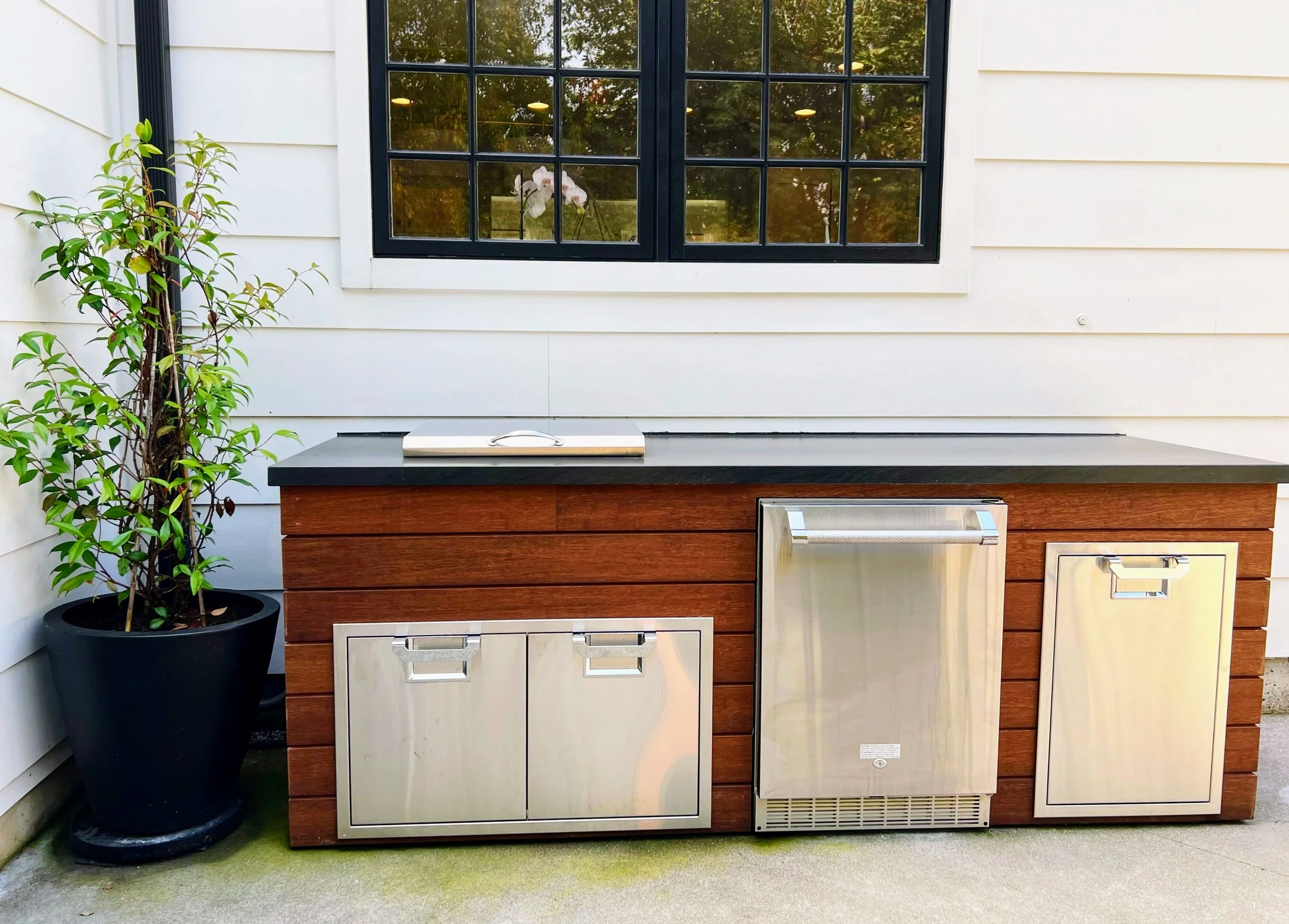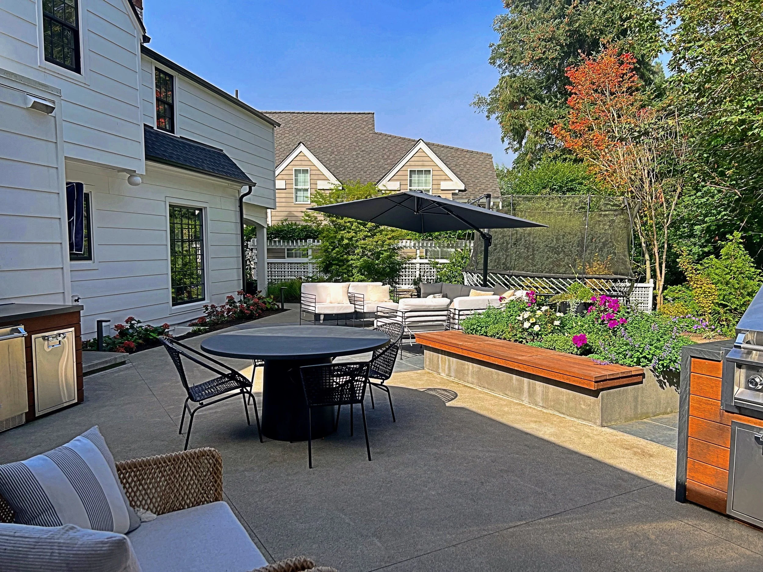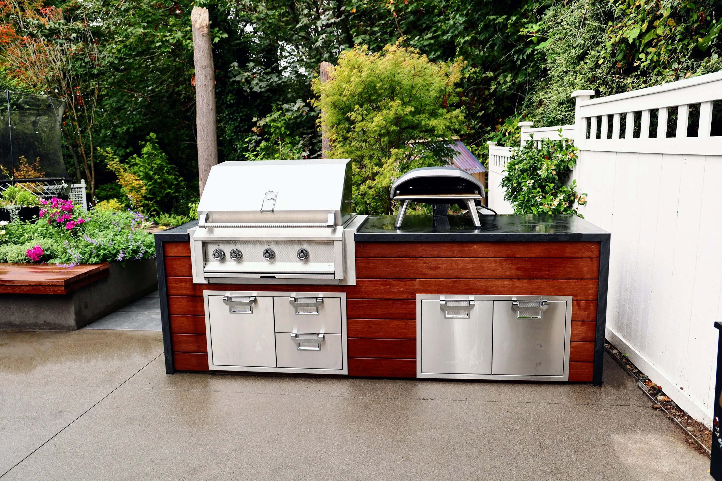 Design an outdoor cooking area with a built-in bench for extra seating.