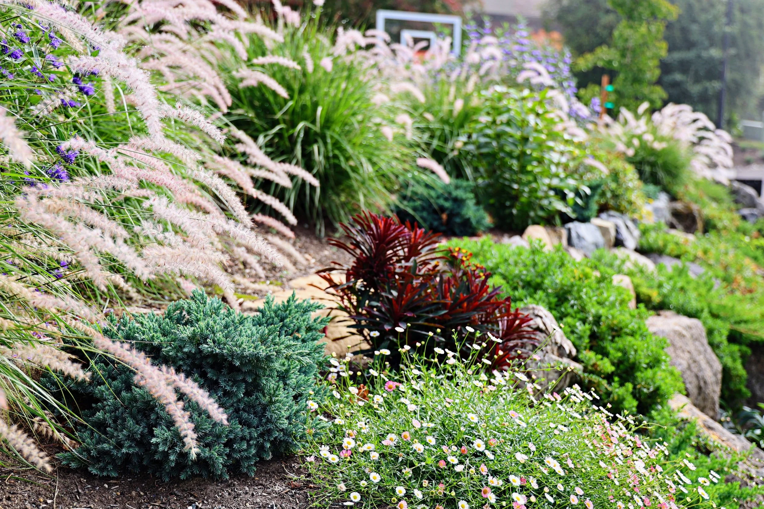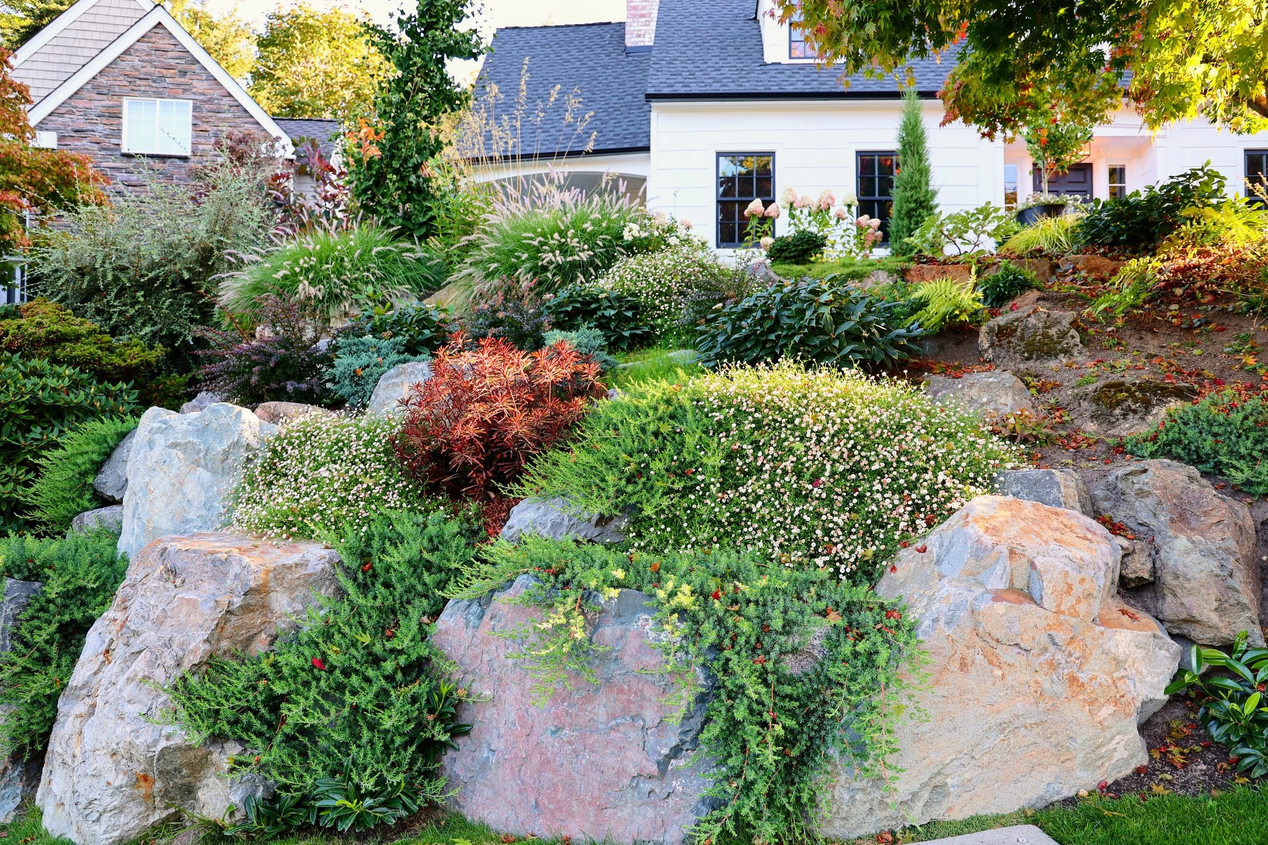 The front yard rockery is sloping and needs evergreen plants.