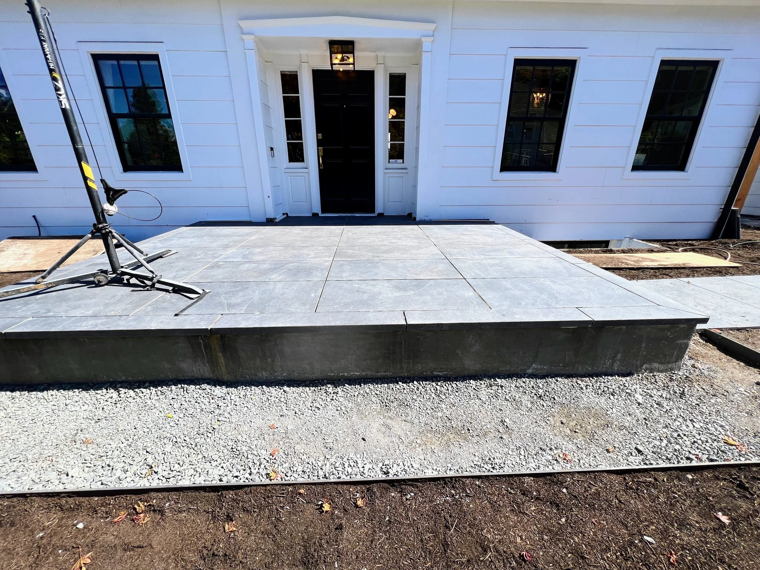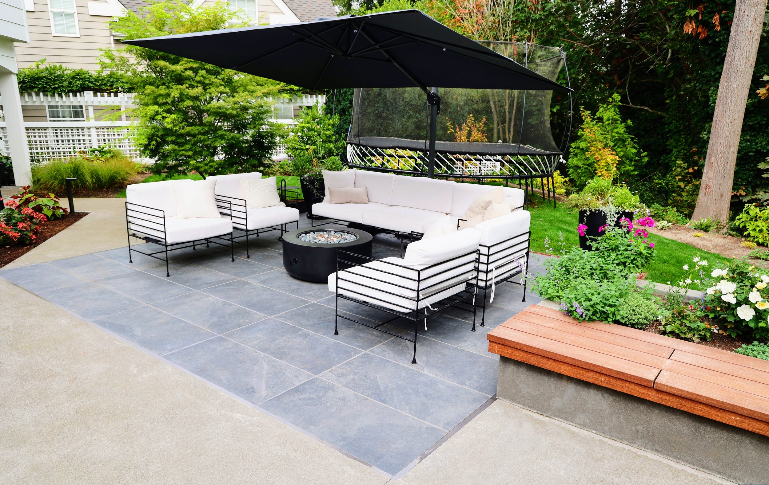Create a separate space for the lounge firepit patio by using porcelain pavers to define the space.