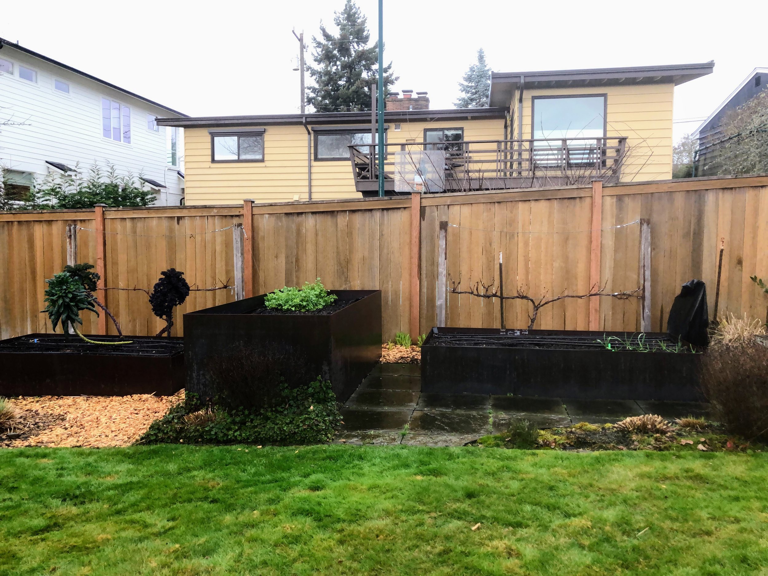 Design a screen that doubles as a grape trellis to create privacy on the north side.