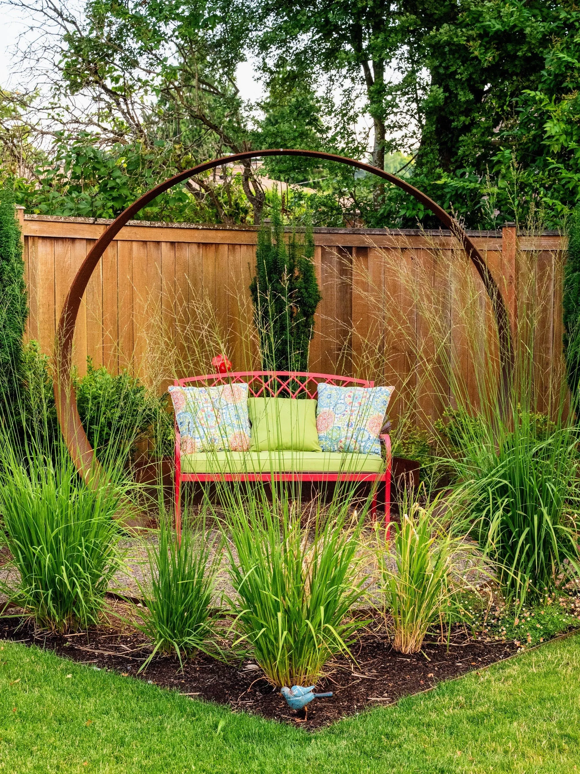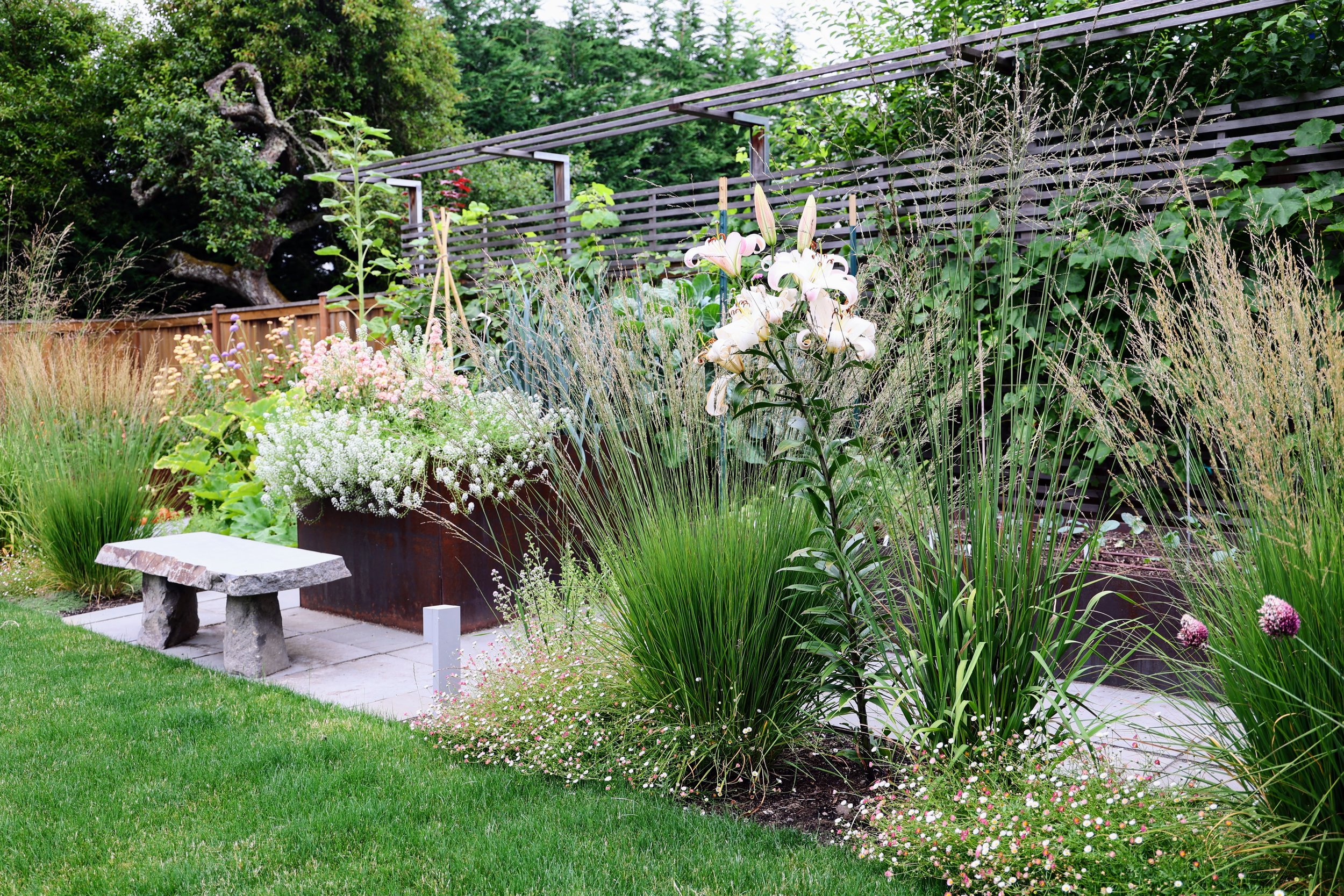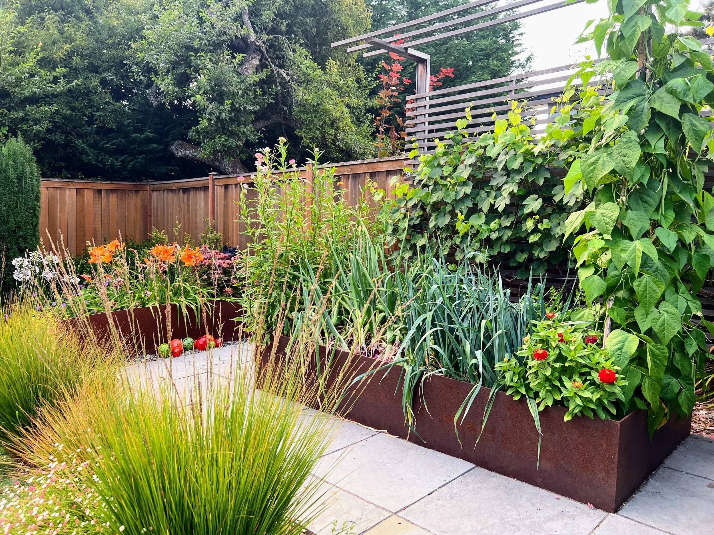 Pave the veggie area and include a bench to create a garden room. Reuse existing steel pieces to enclose the veggie area.