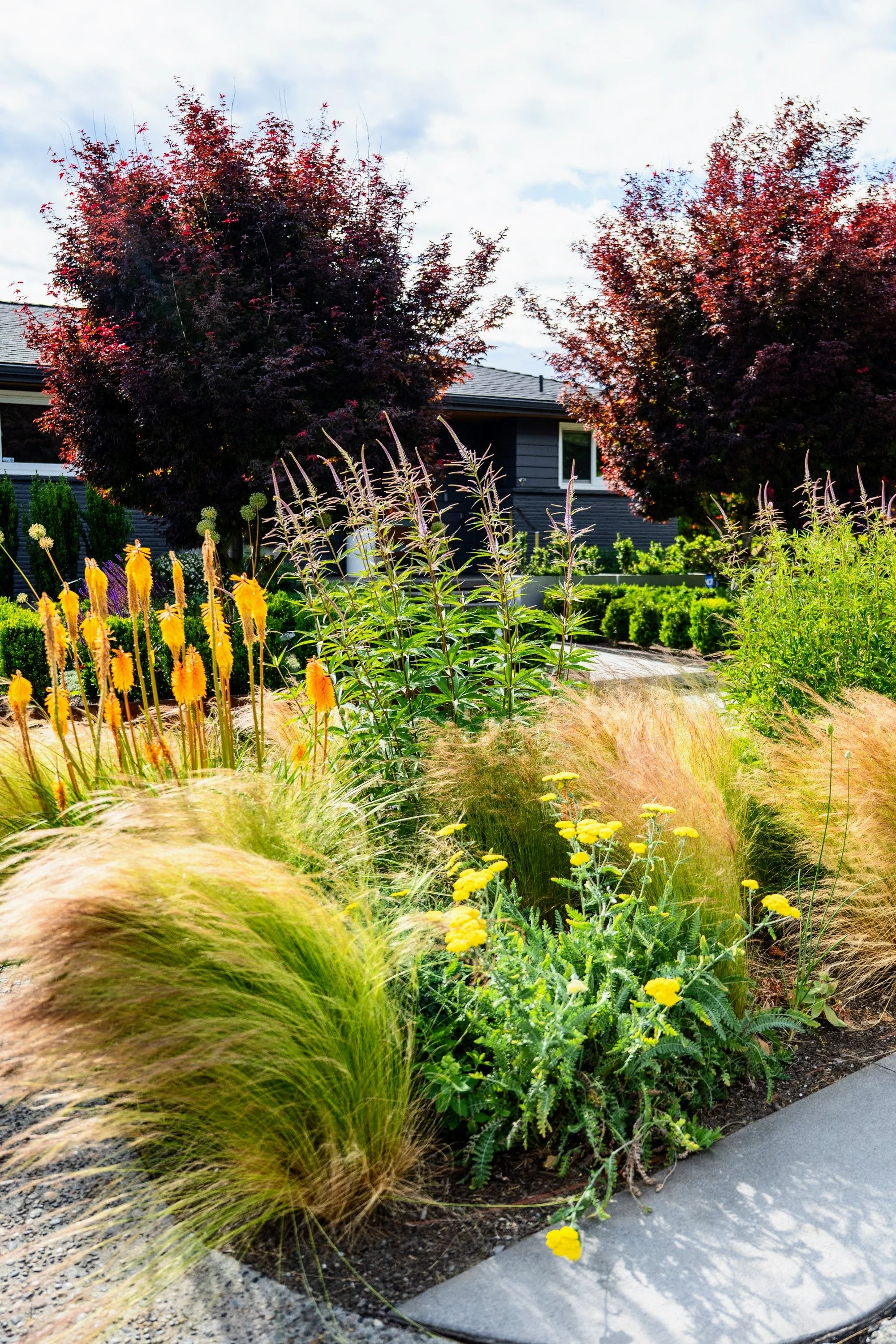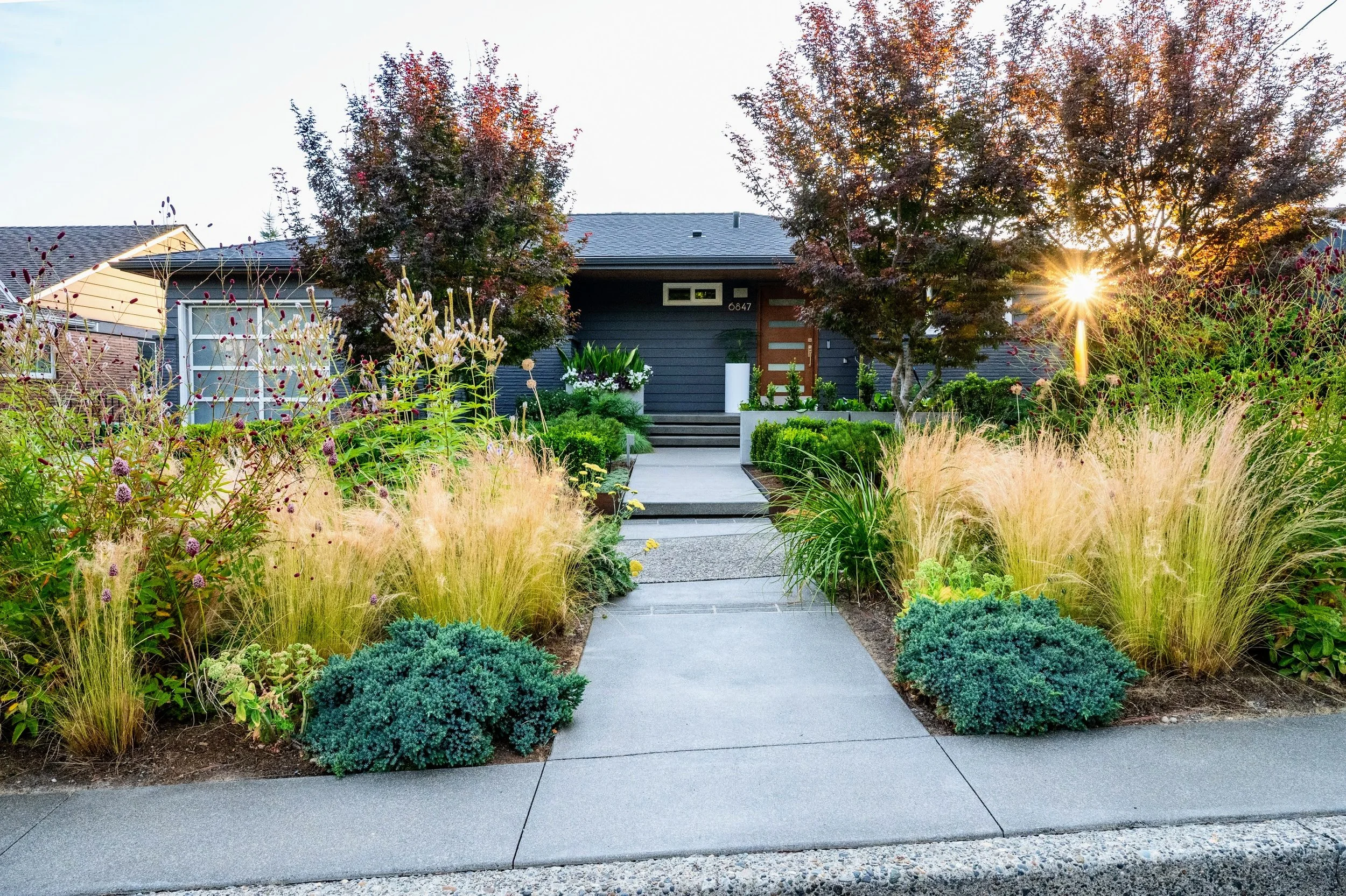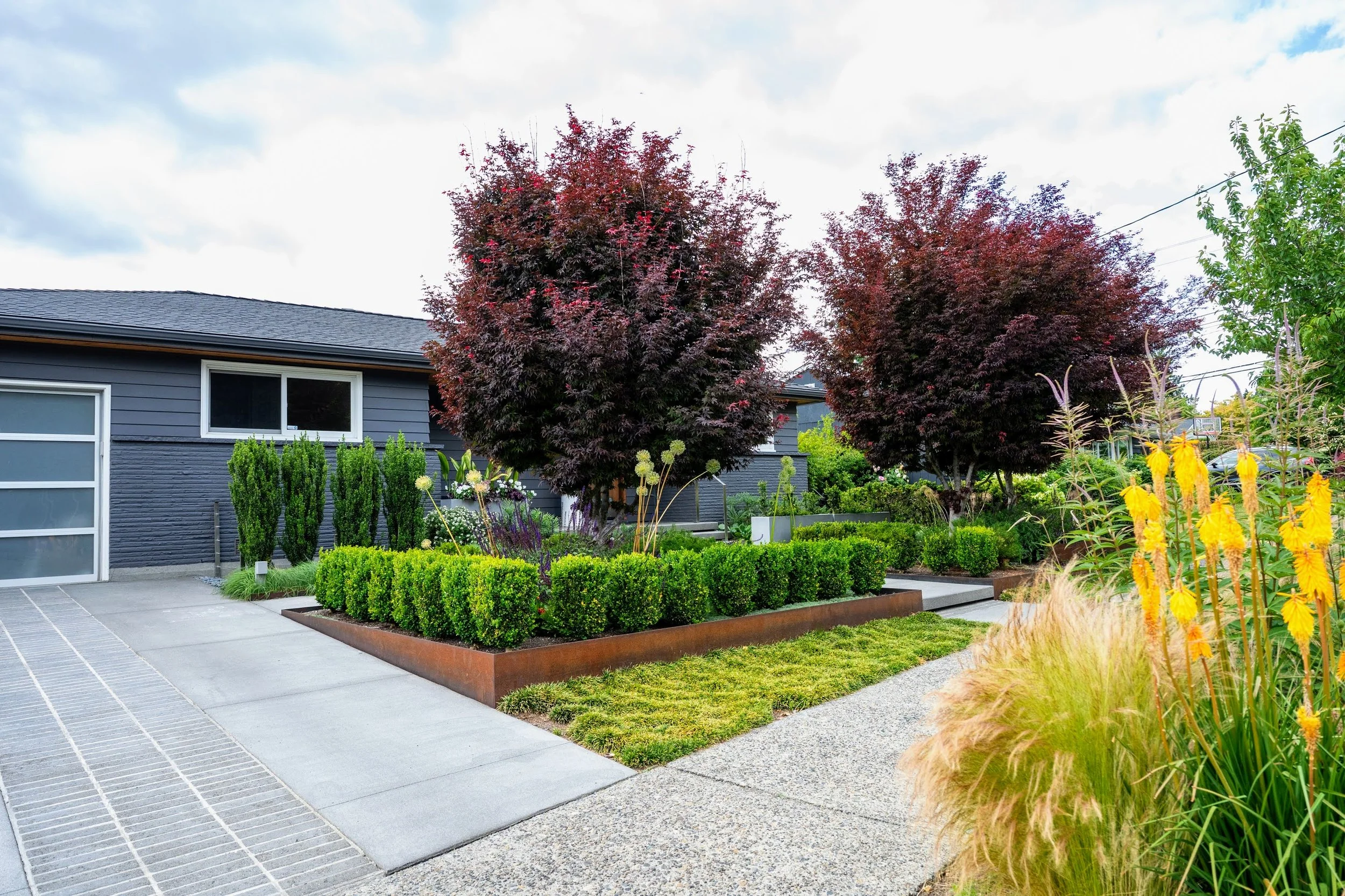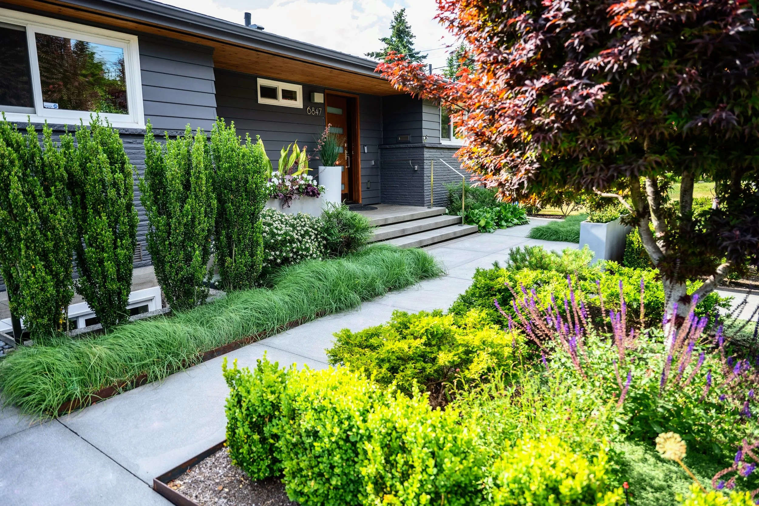 Make the front yard feel bigger, more private and add dynamic blooming and evergreen plants.