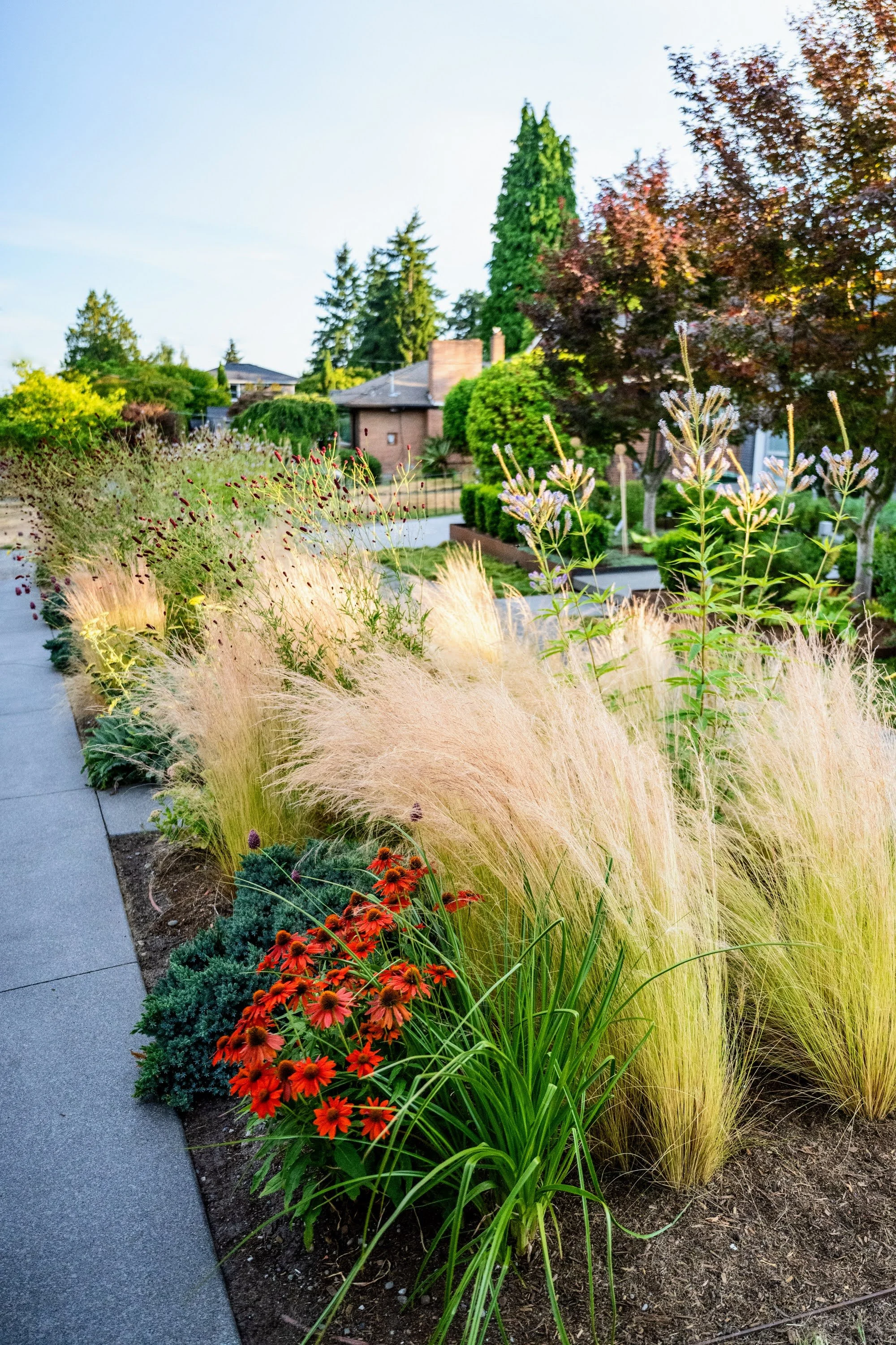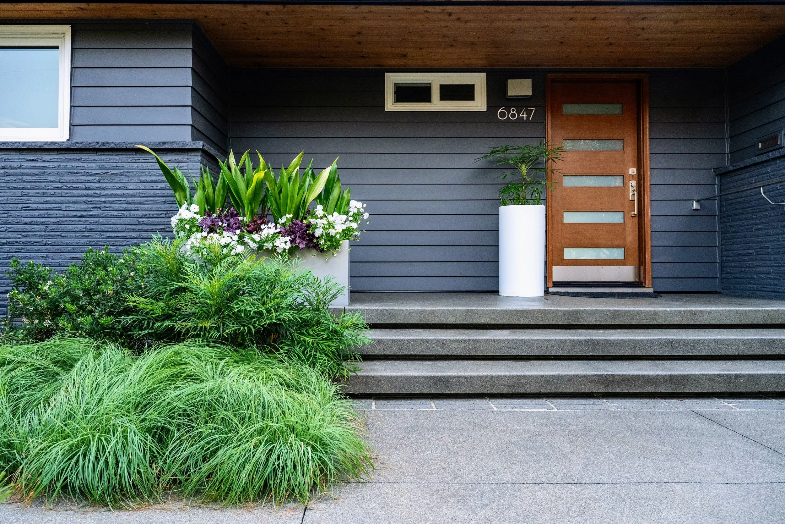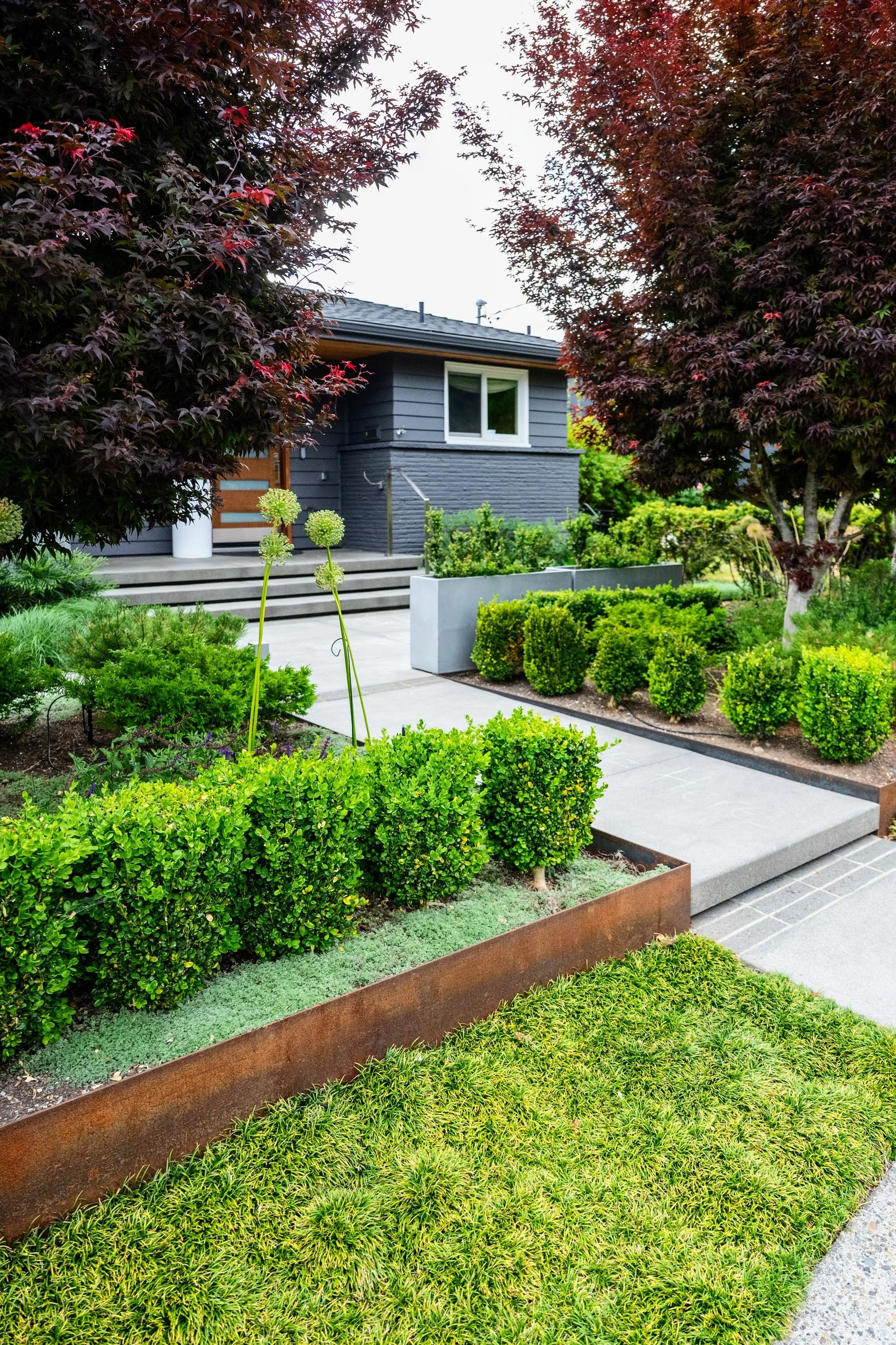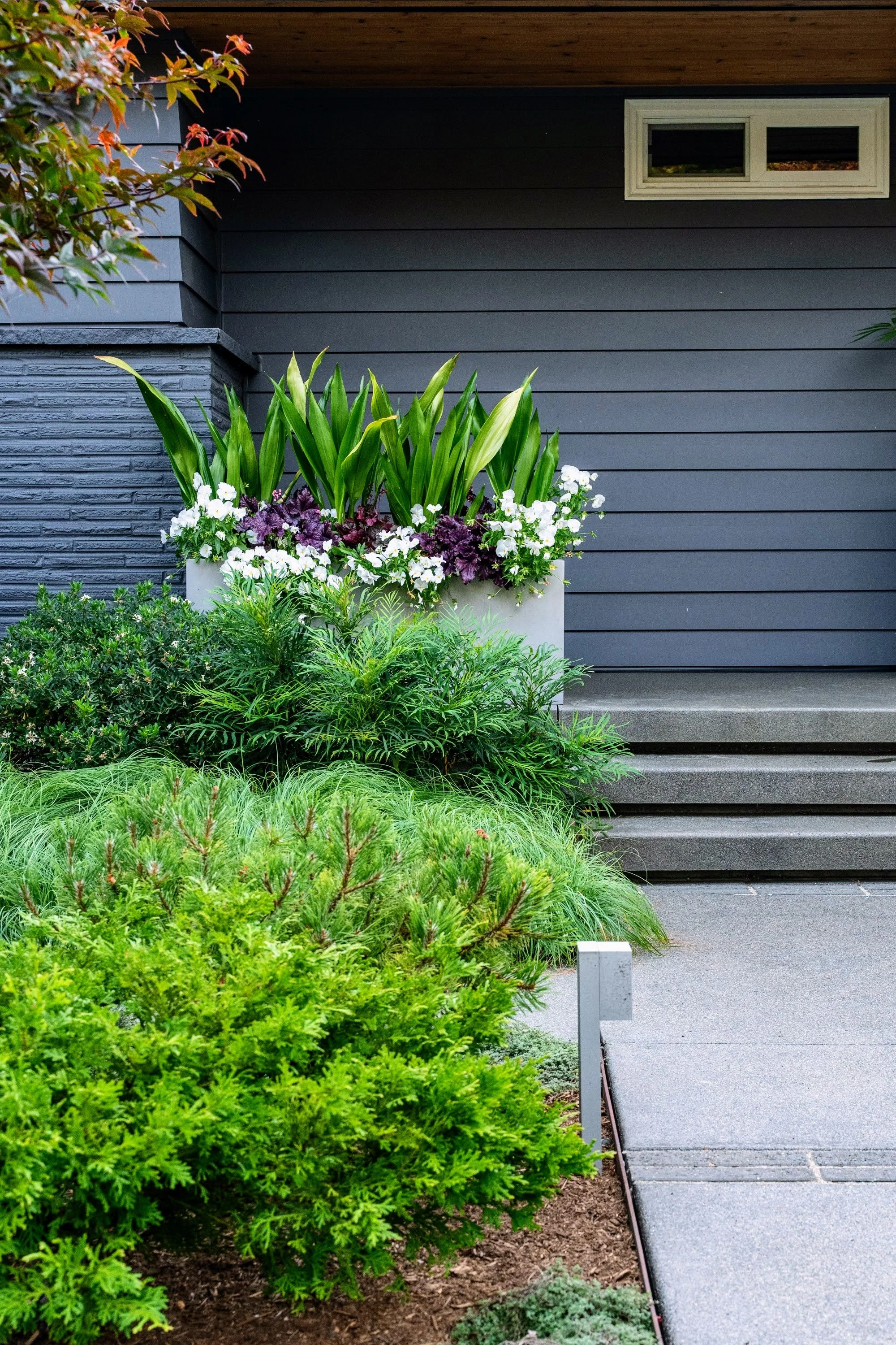 Make the front yard feel bigger, more private and add dynamic blooming and evergreen plants.