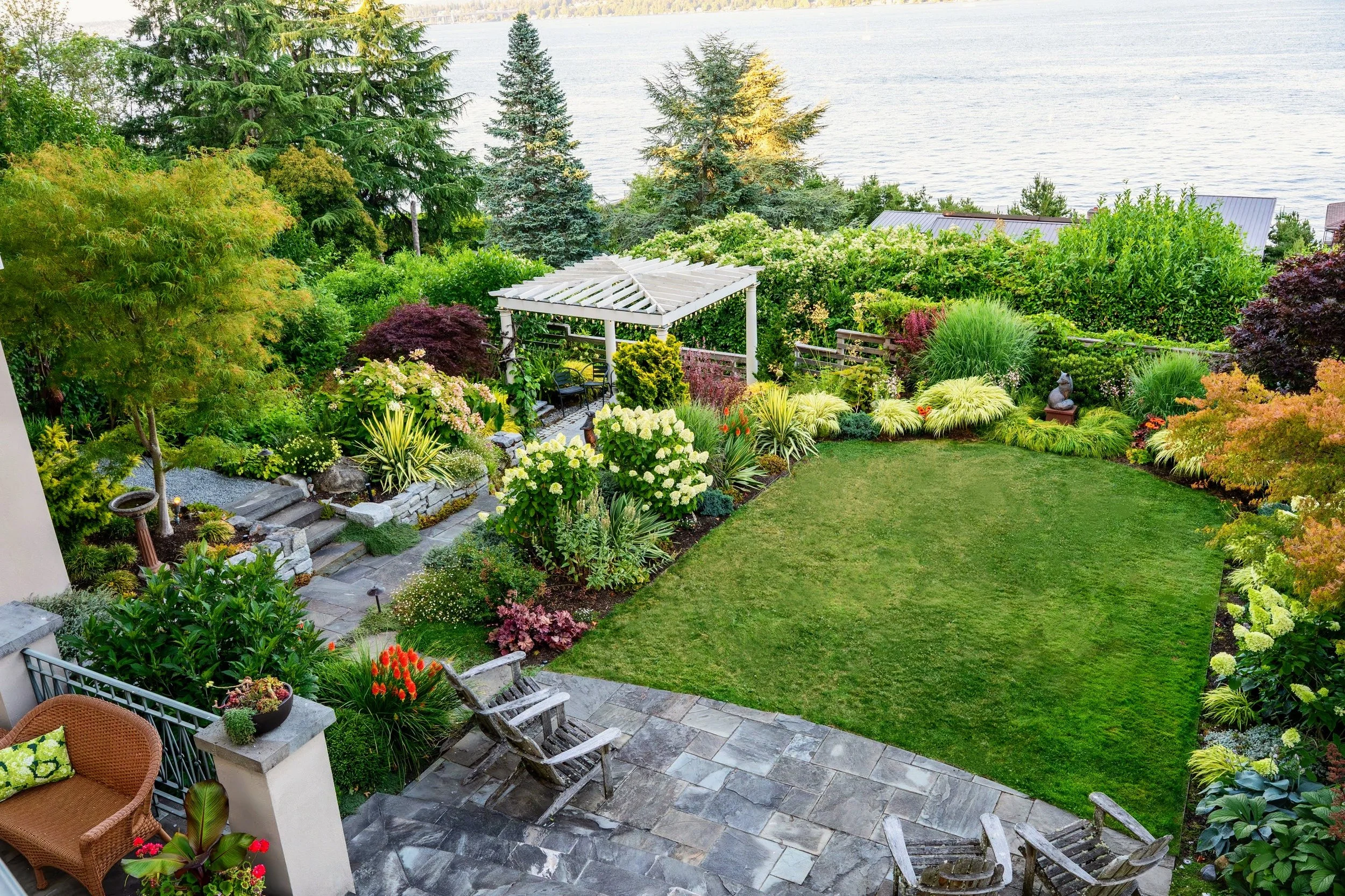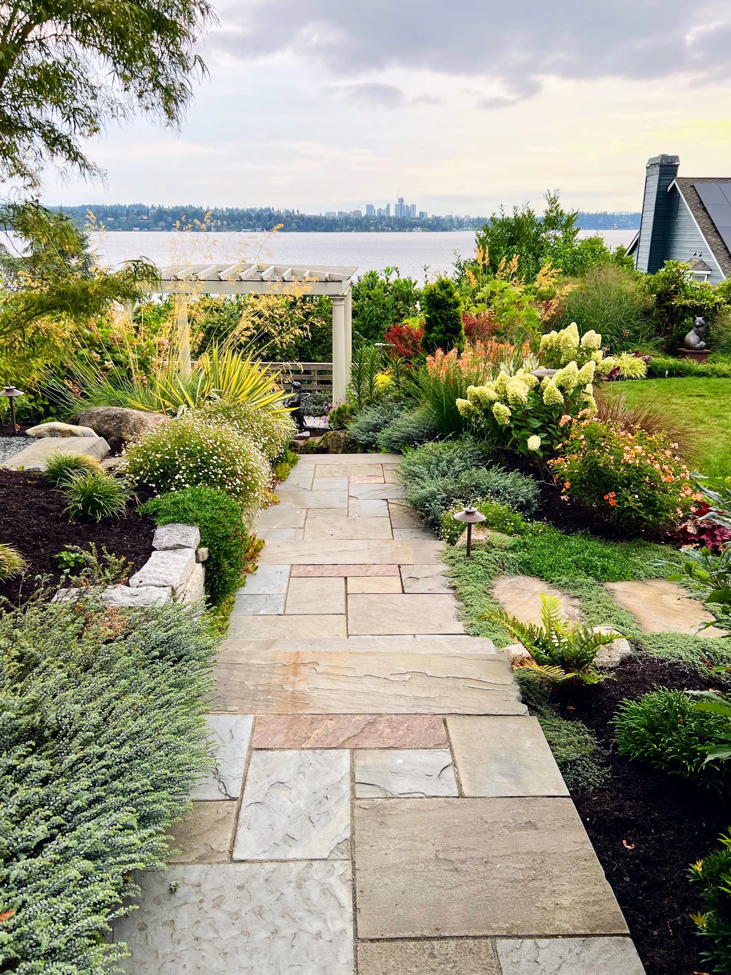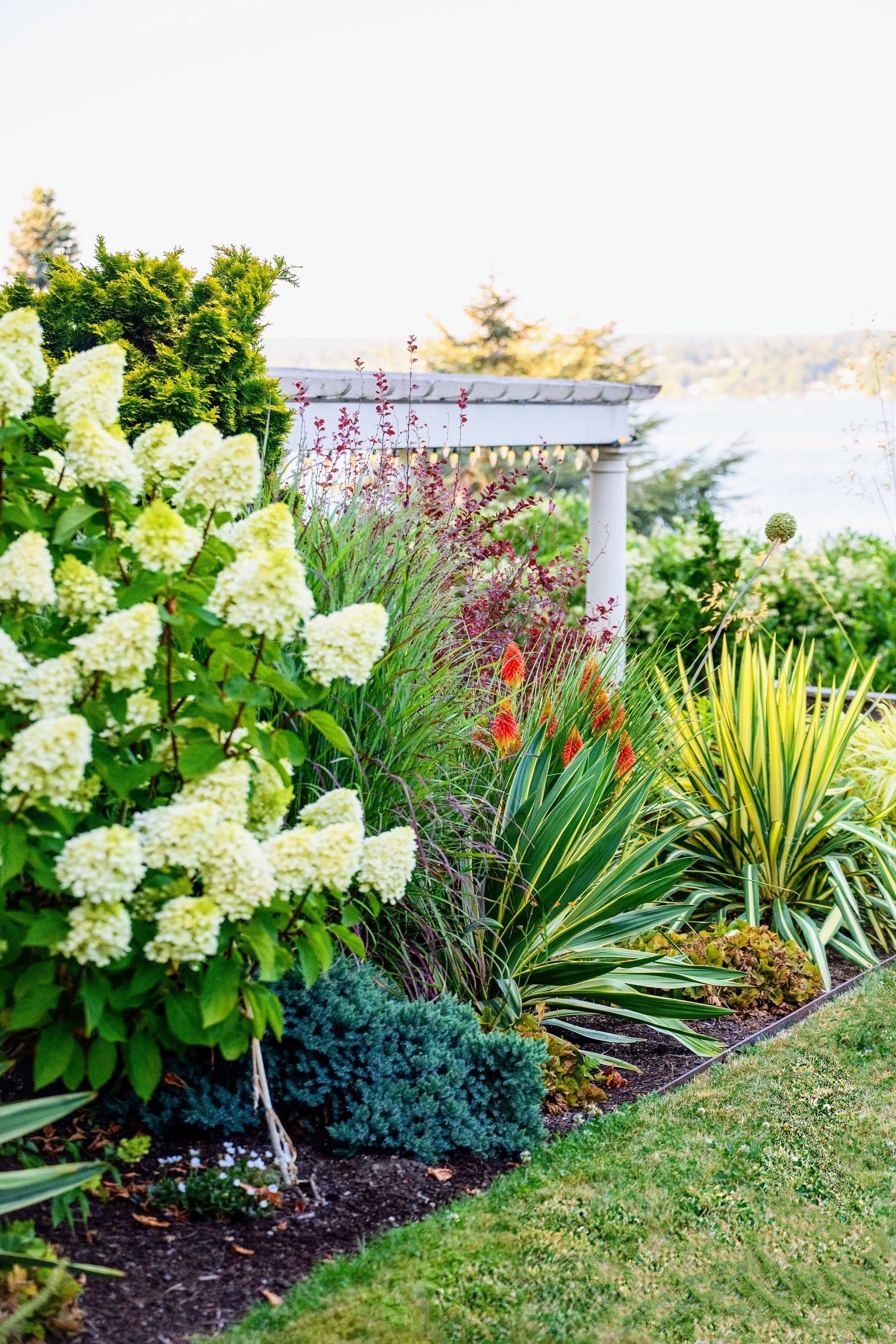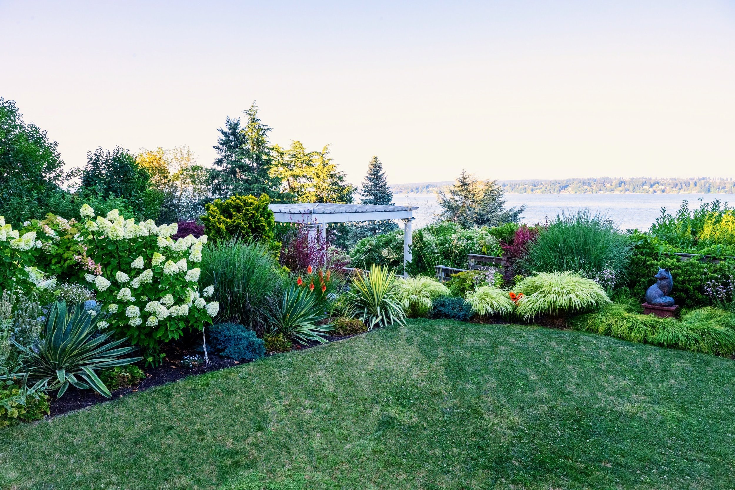 Create a planting plan with year-round color and texture while preserving the lake and mountain views.