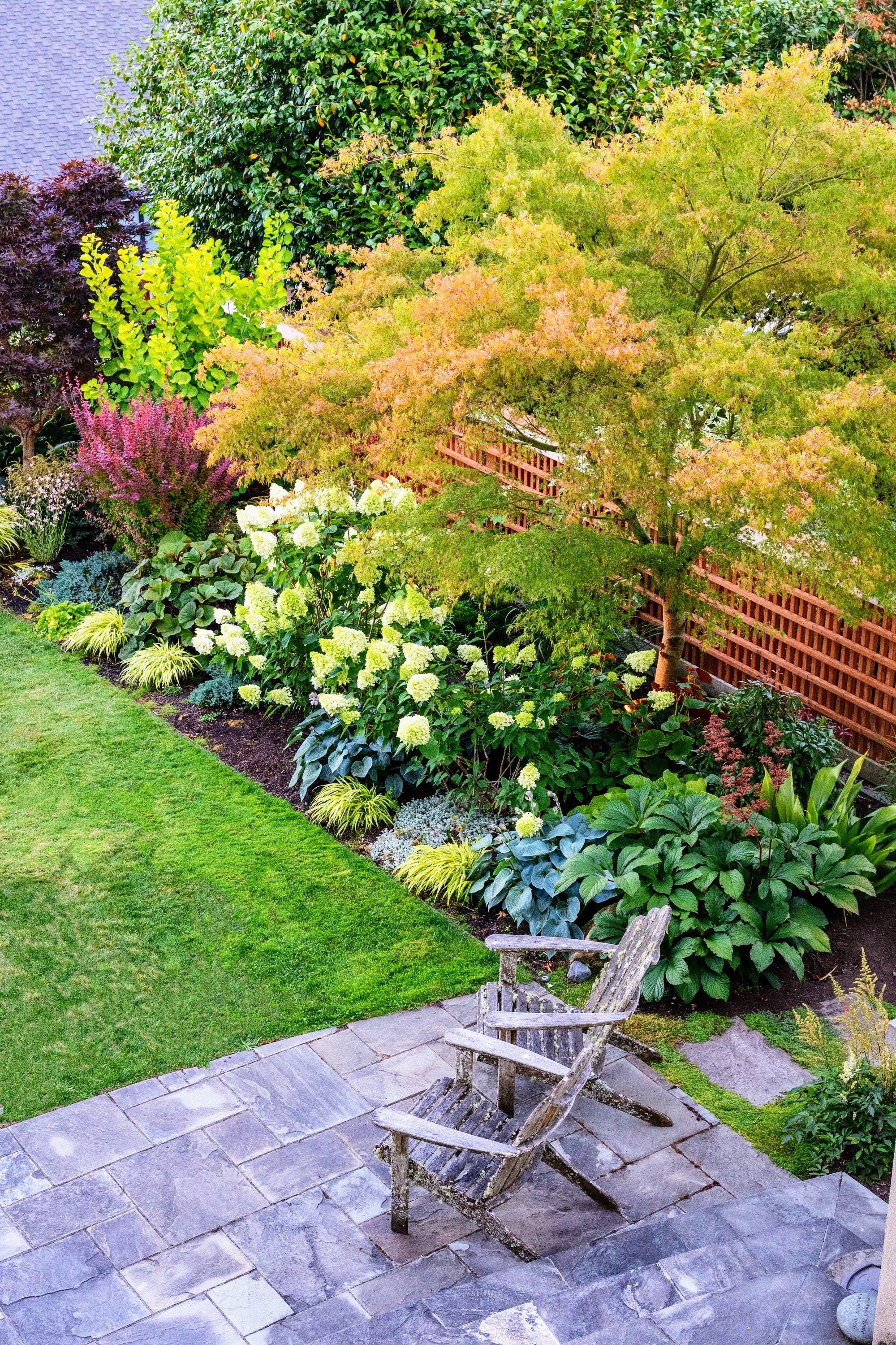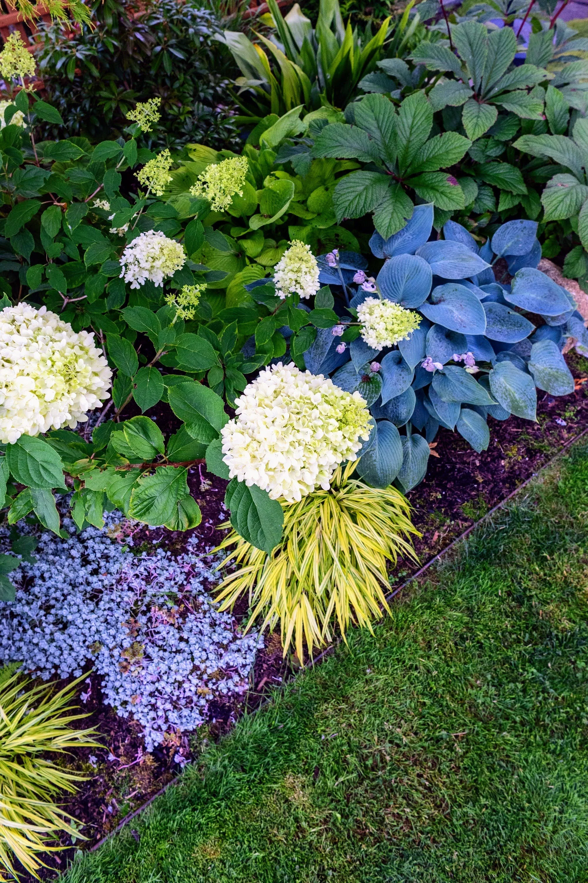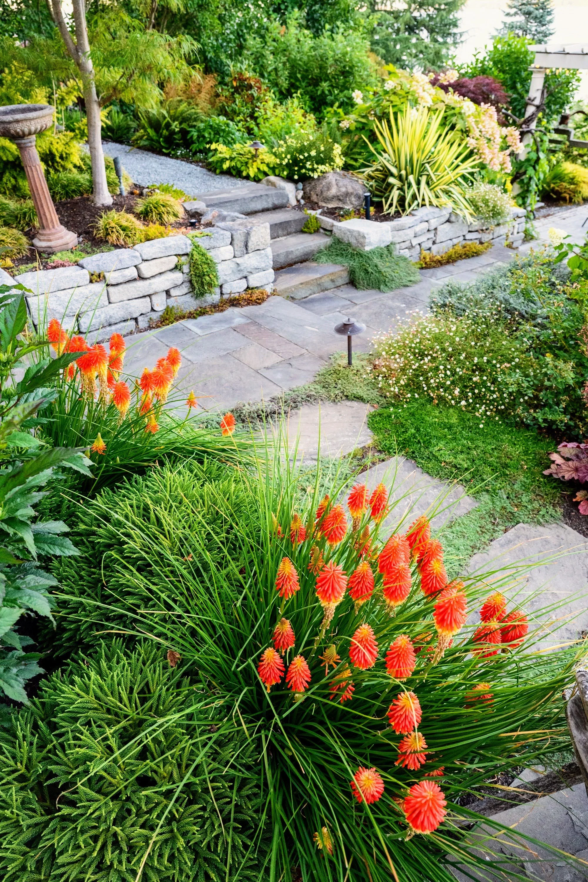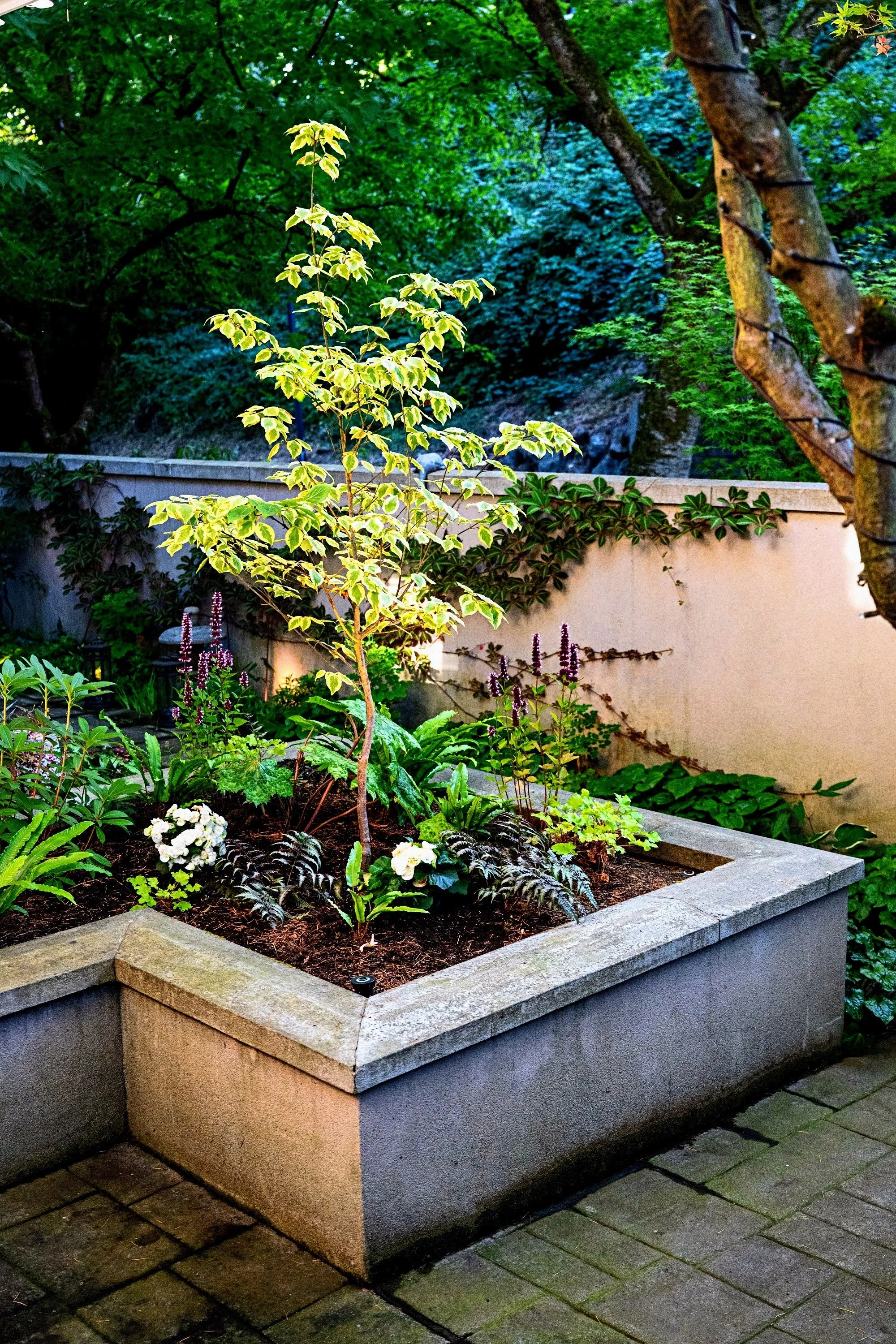Use tough evergreen ferns, and groundcovers to provide a green scape for year-round interest. Use container plantings for color and bulbs for dynamic change throughout the growing season.
