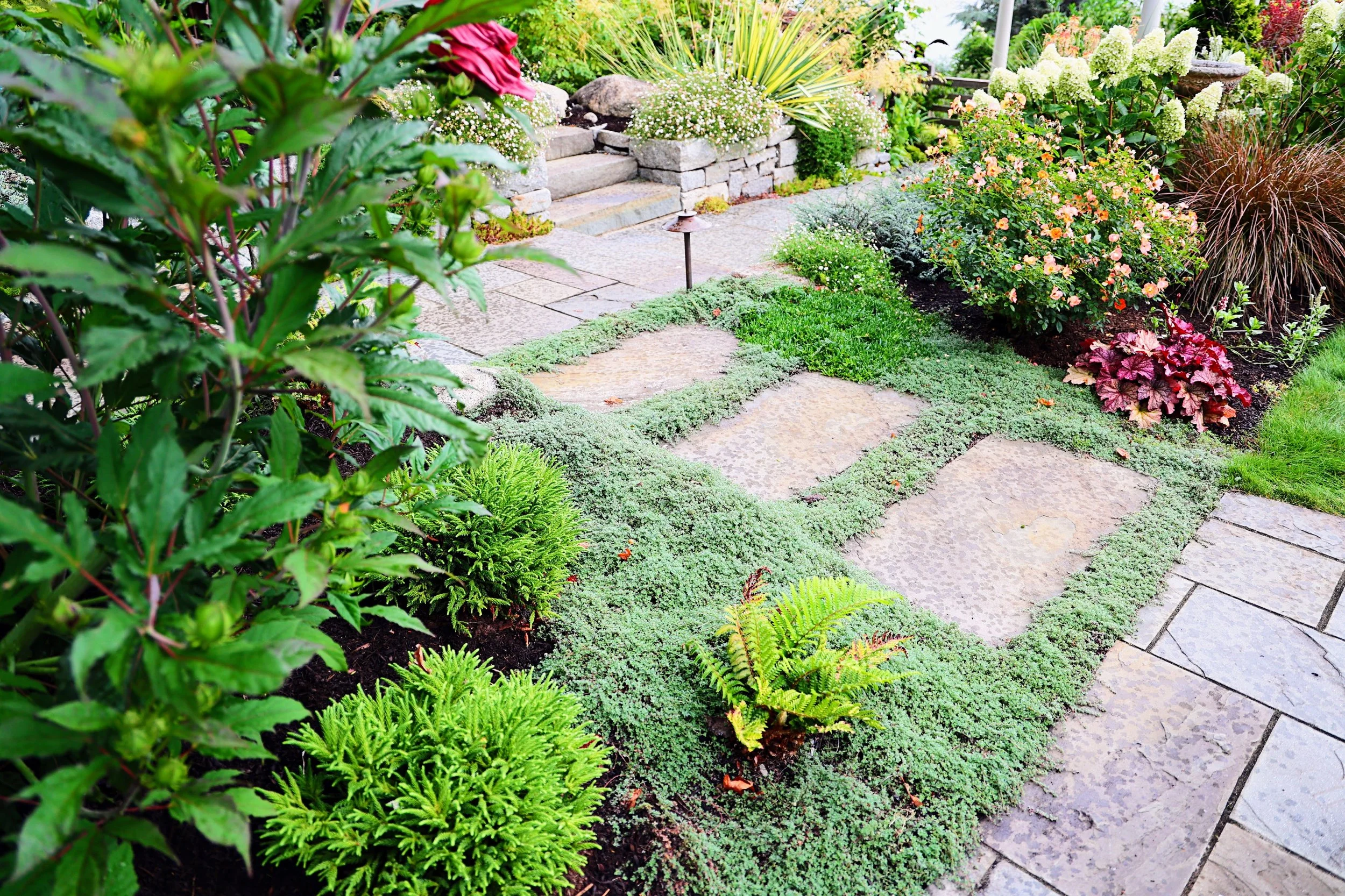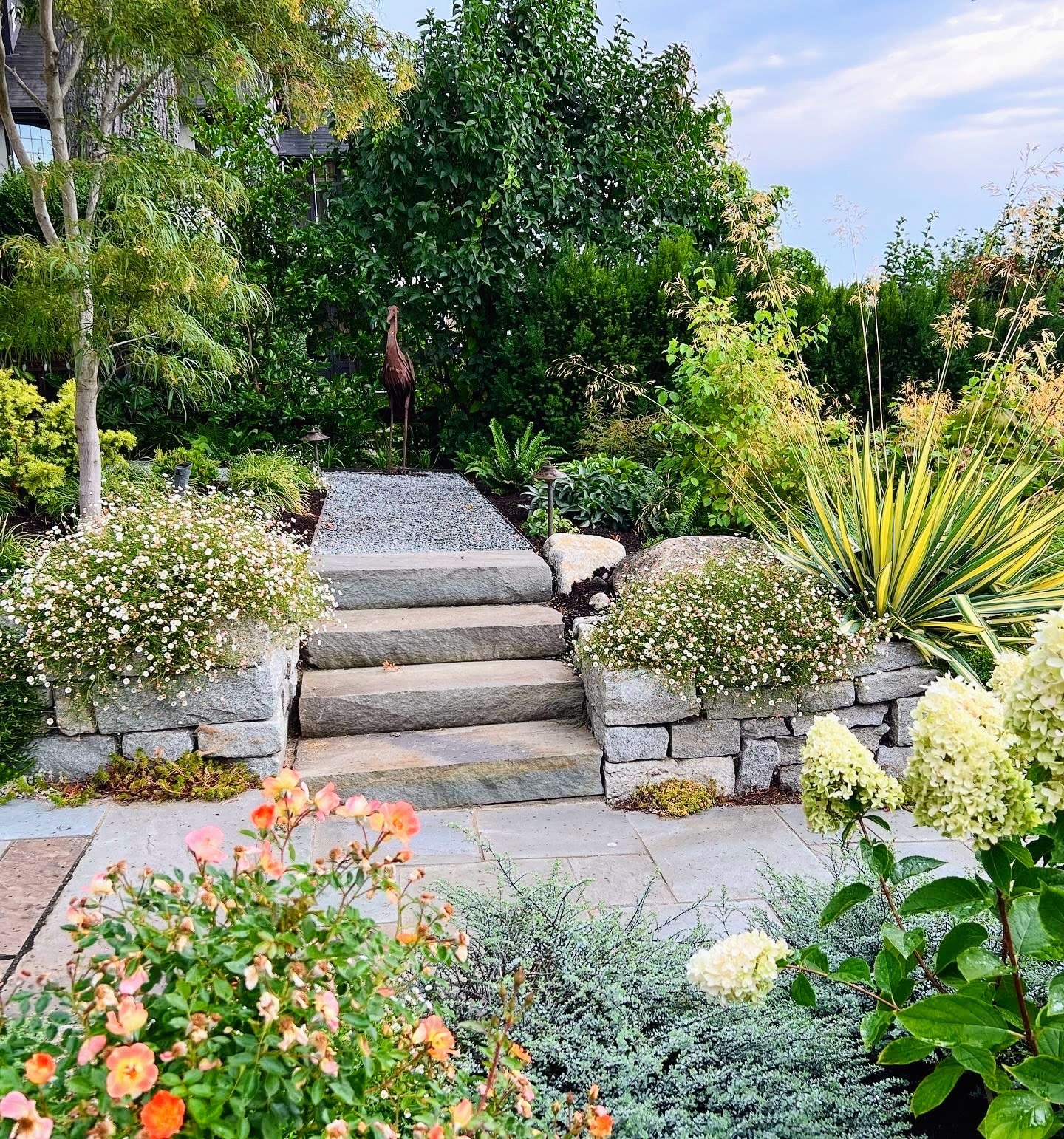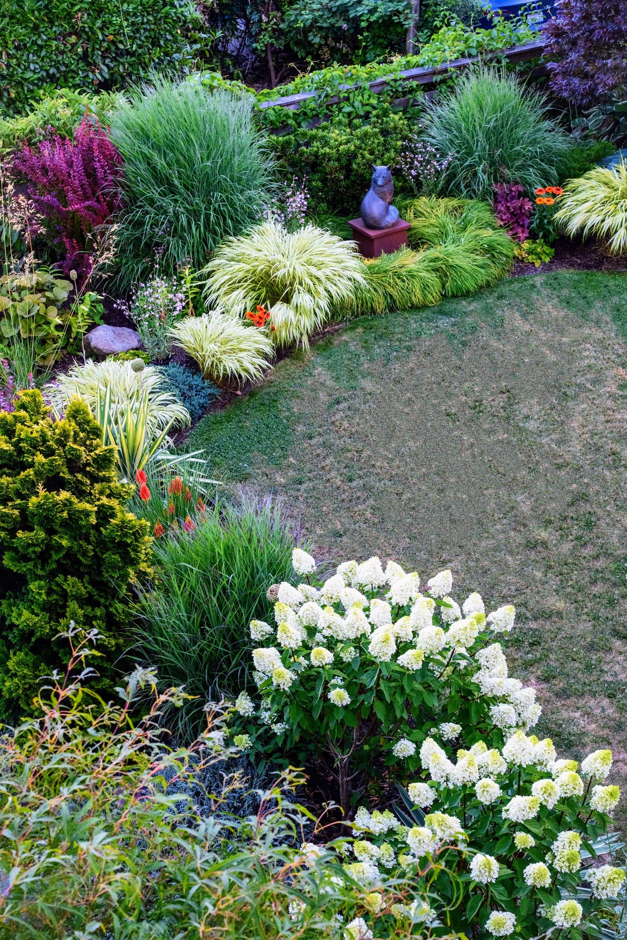 Use tough evergreen ferns, and groundcovers to provide a green scape for year-round interest. Use container plantings for color and bulbs for dynamic change throughout the growing season.