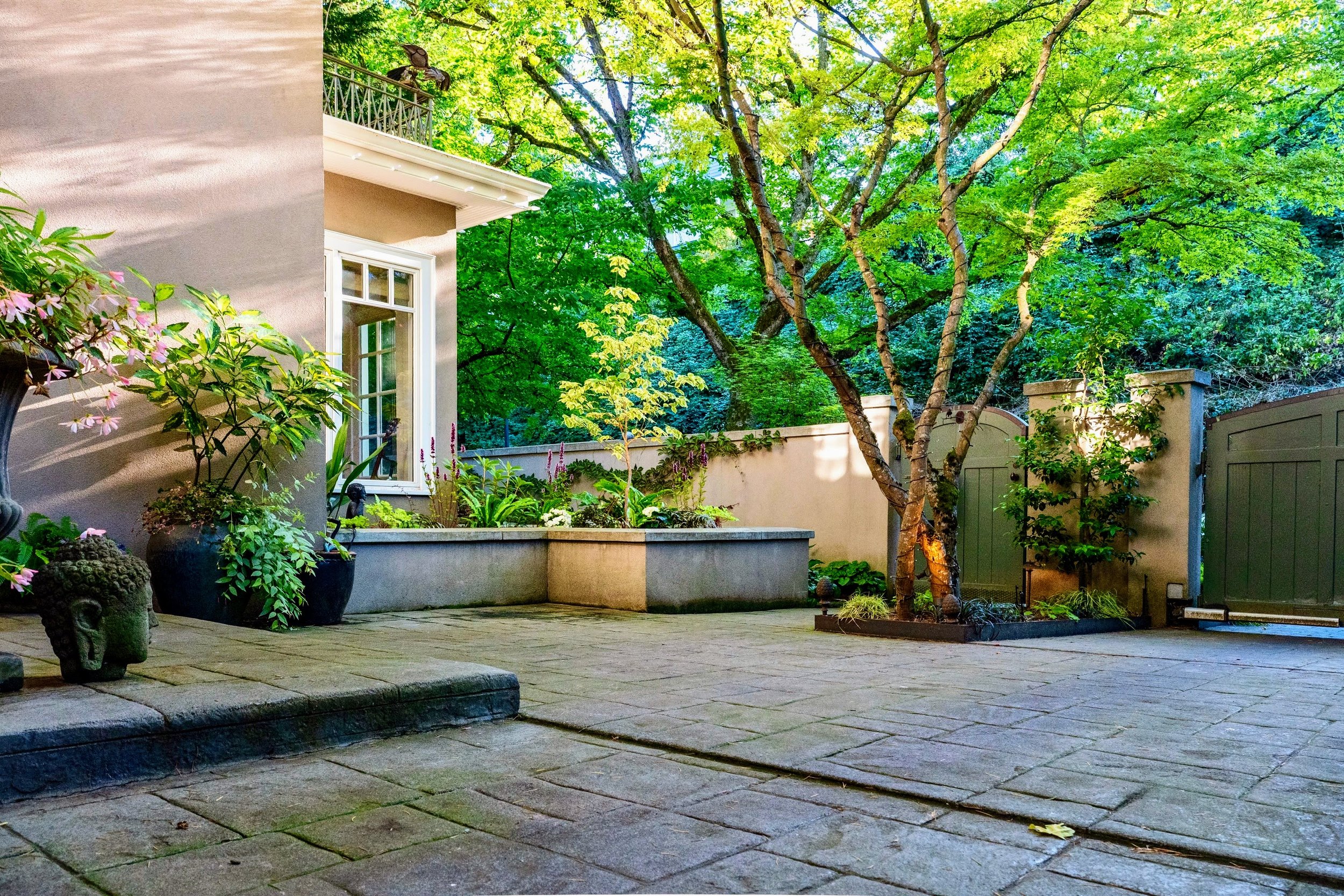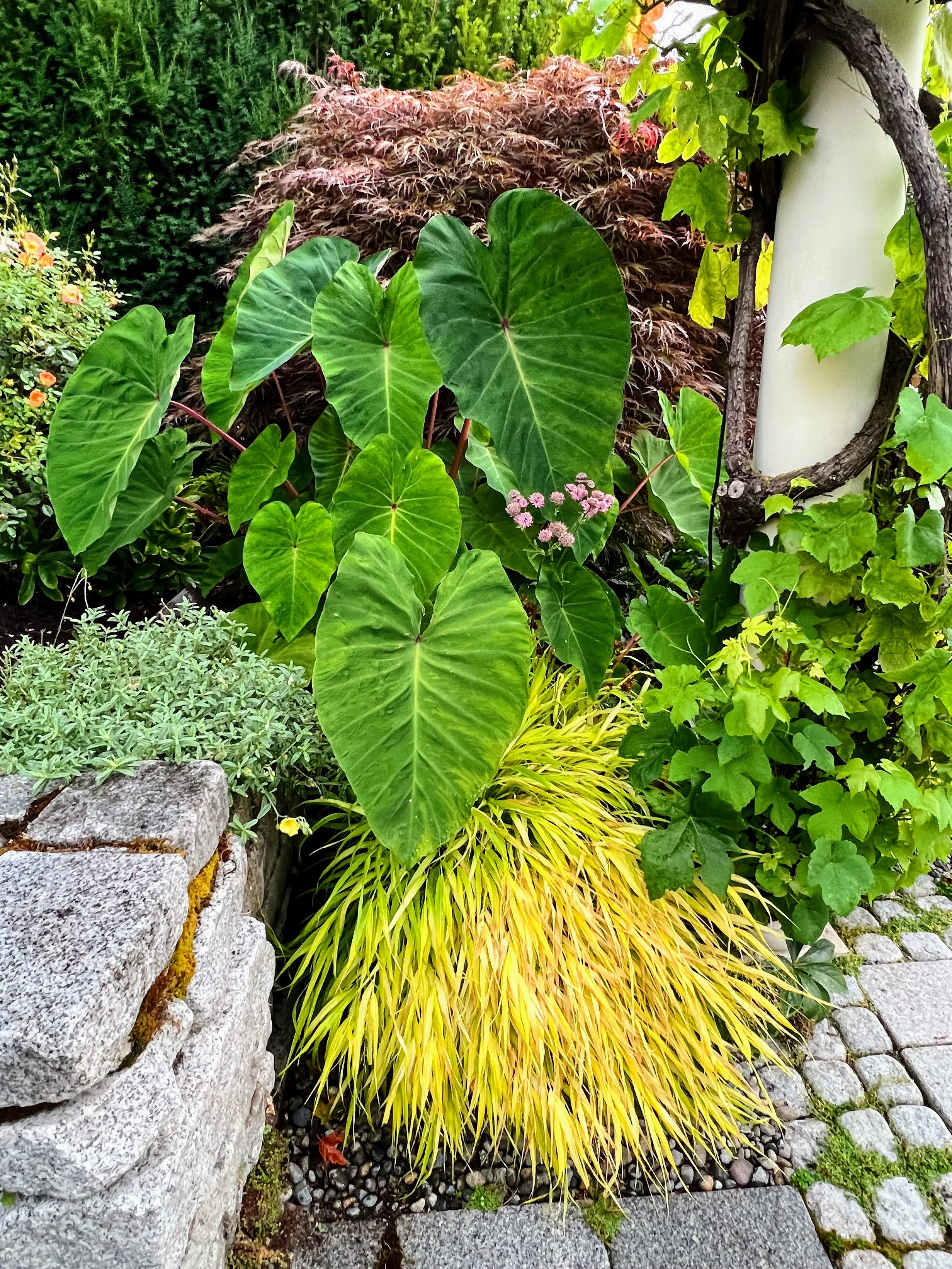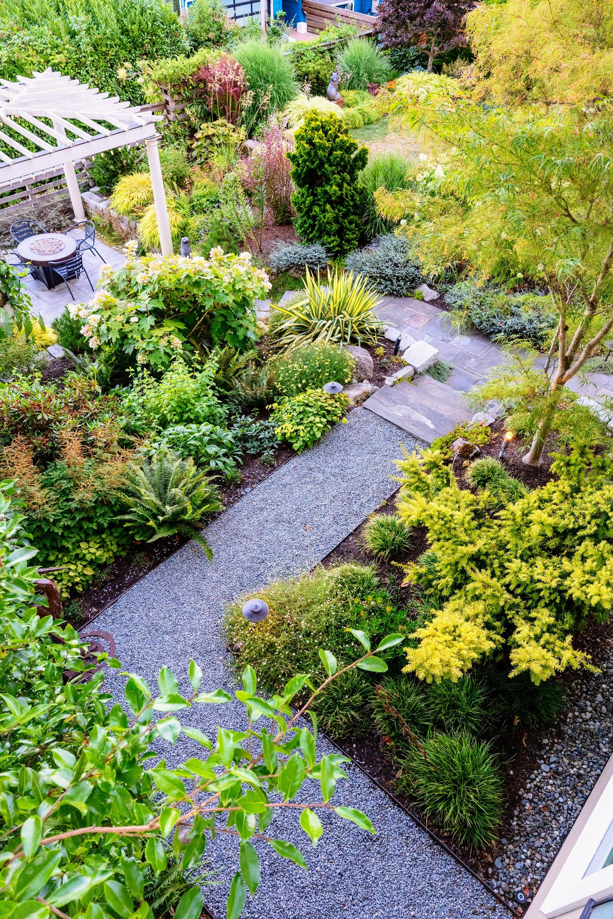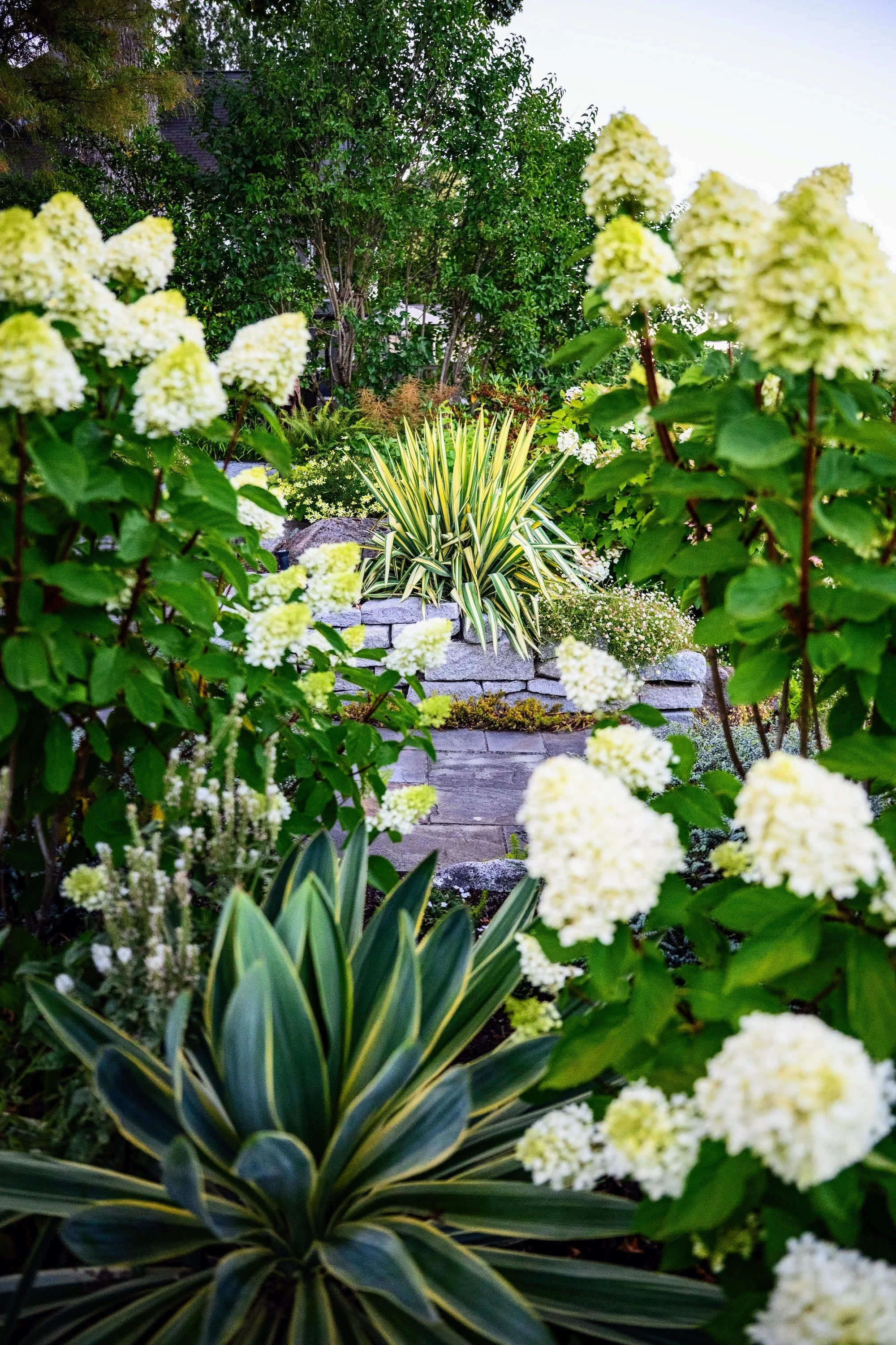 Use tough evergreen ferns, and groundcovers to provide a green scape for year-round interest. Use container plantings for color and bulbs for dynamic change throughout the growing season.