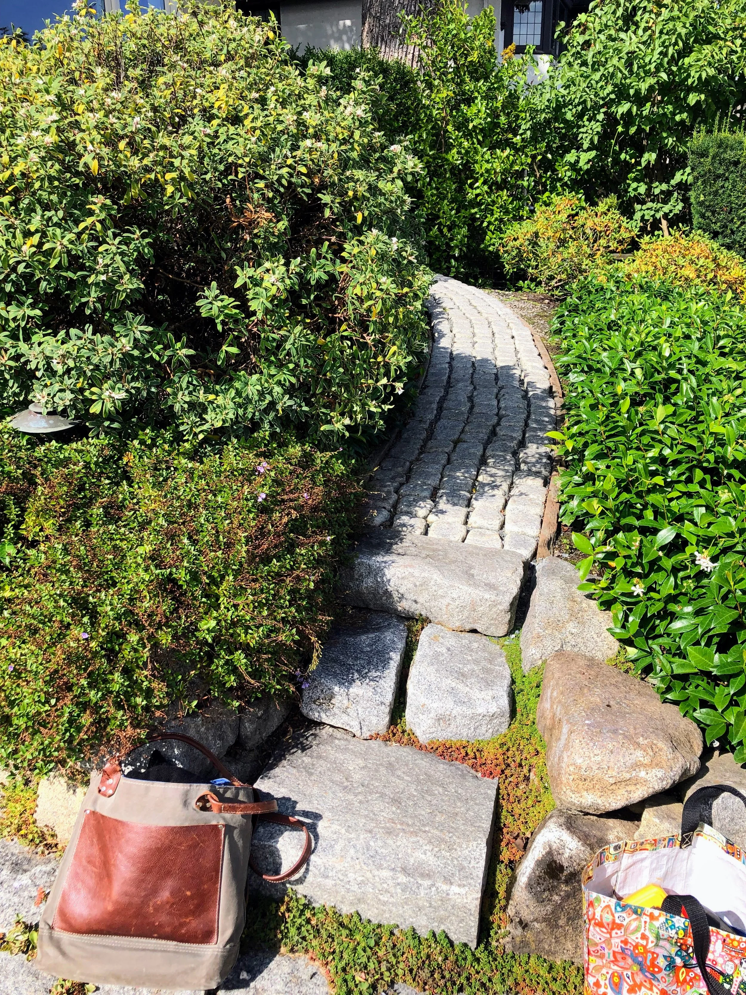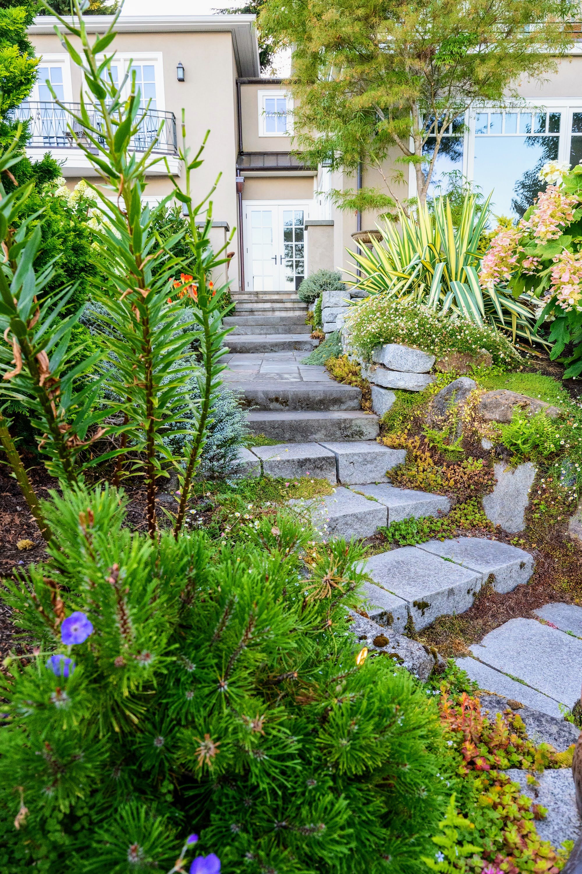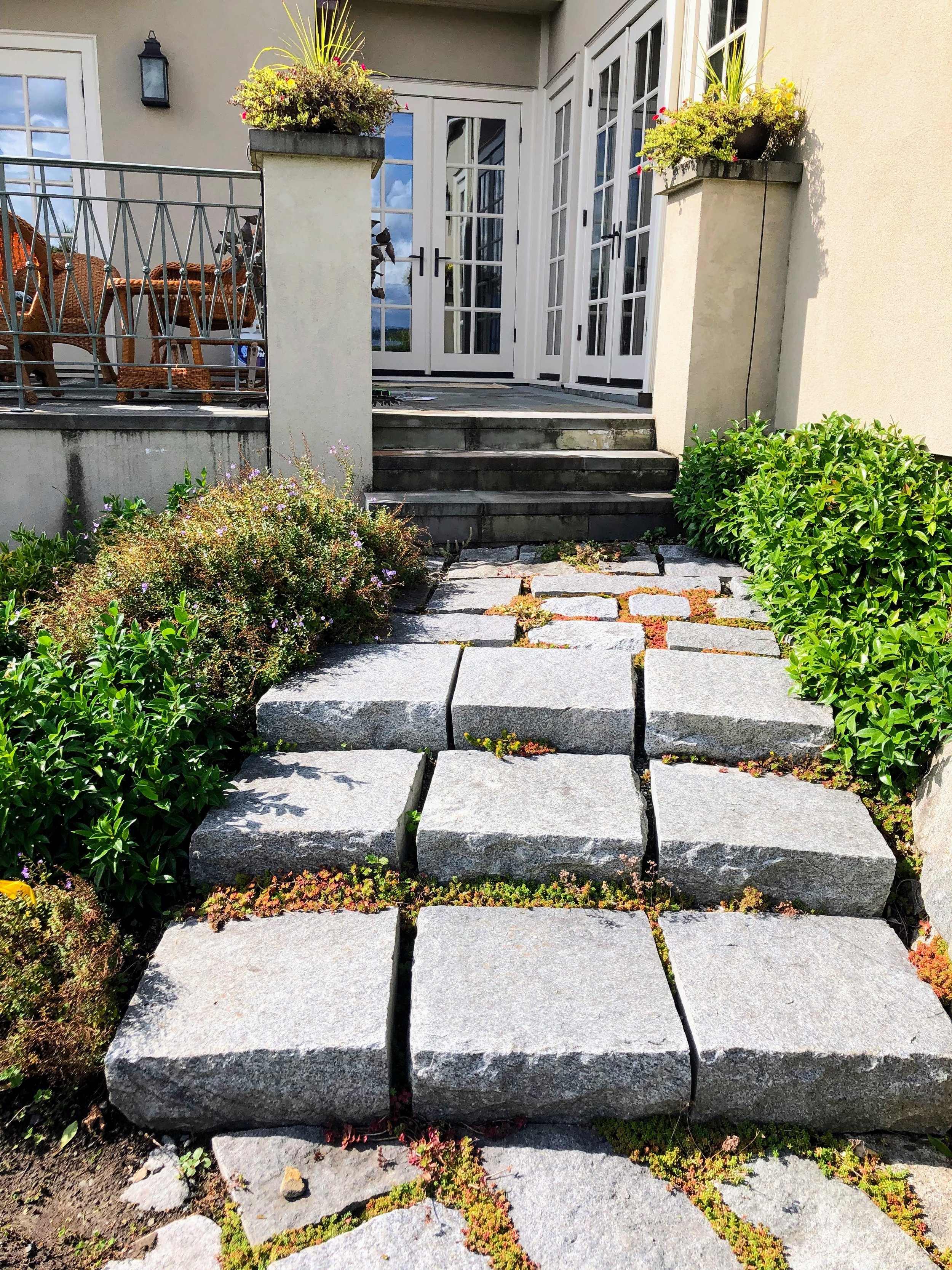 Recycle bumpy granite blocks from existing pathways to create retaining walls and stop erosion. Recycle granite cobbles into a decorative frame for the pergola patio.